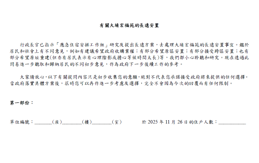 點新聞透過居於宏福苑的讀者取得該份問卷,當中共有4項問題,主要了解業主住戶認為的長遠安置重要原則、會否接受政府收購業權、會否購買居屋或私樓,以及會否考慮直接「樓換樓」等。