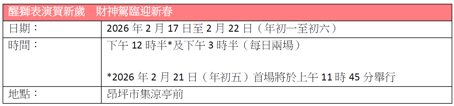 昂坪360邀請了專業醒獅團隊及財神,年初一至年初六(2月17日至22日)每日中午12時半及下午3時半,在昂坪市集涼亭前進行醒獅表演,以及財神向賓客派發「金元寶」,與賓客一同慶祝新春,並為昂坪市集加添節慶色彩!年初五(2月21日)首場醒獅及財神表演,將於提前於上午11時45分舉行。