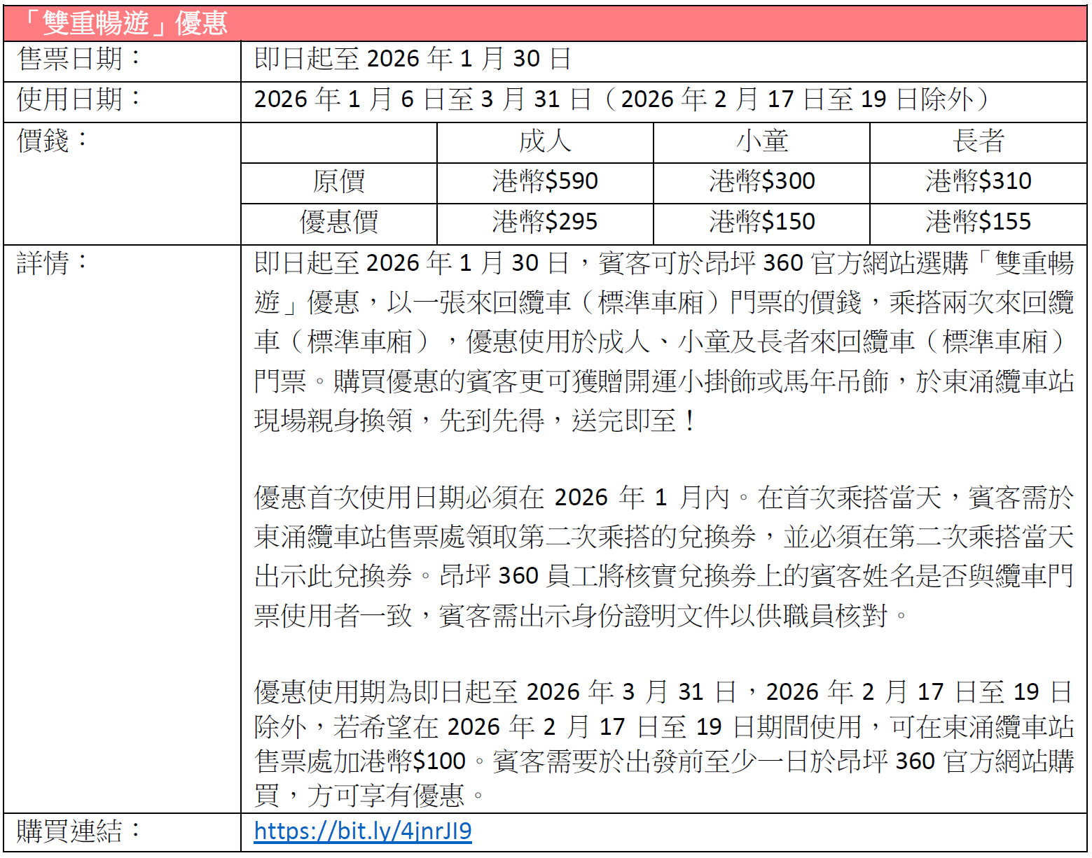 昂坪360亦為賓客特別準備了「雙重暢遊」優惠!即日起至1月30日,賓客可於昂坪360官方網站選購「雙重暢遊」優惠,以一張來回纜車(標準車廂)門票的價錢,在3月底前乘搭兩次來回纜車(標準車廂)。購買優惠的賓客更可獲贈開運小掛飾或馬年吊飾,於東涌纜車站現場親身換領,先到先得,送完即止!「雙重暢遊」優惠使用期為即日起至3月31日,首次使用日期必須在1月內。優惠不適用於2月17日至19日,若希望在2月17日至19日期間使用,可在東涌纜車站售票處加港幣$100乘搭來回纜車(標準車廂)。賓客需要於出發前至少1日於昂坪360官方網站購買,方可享有優惠。
