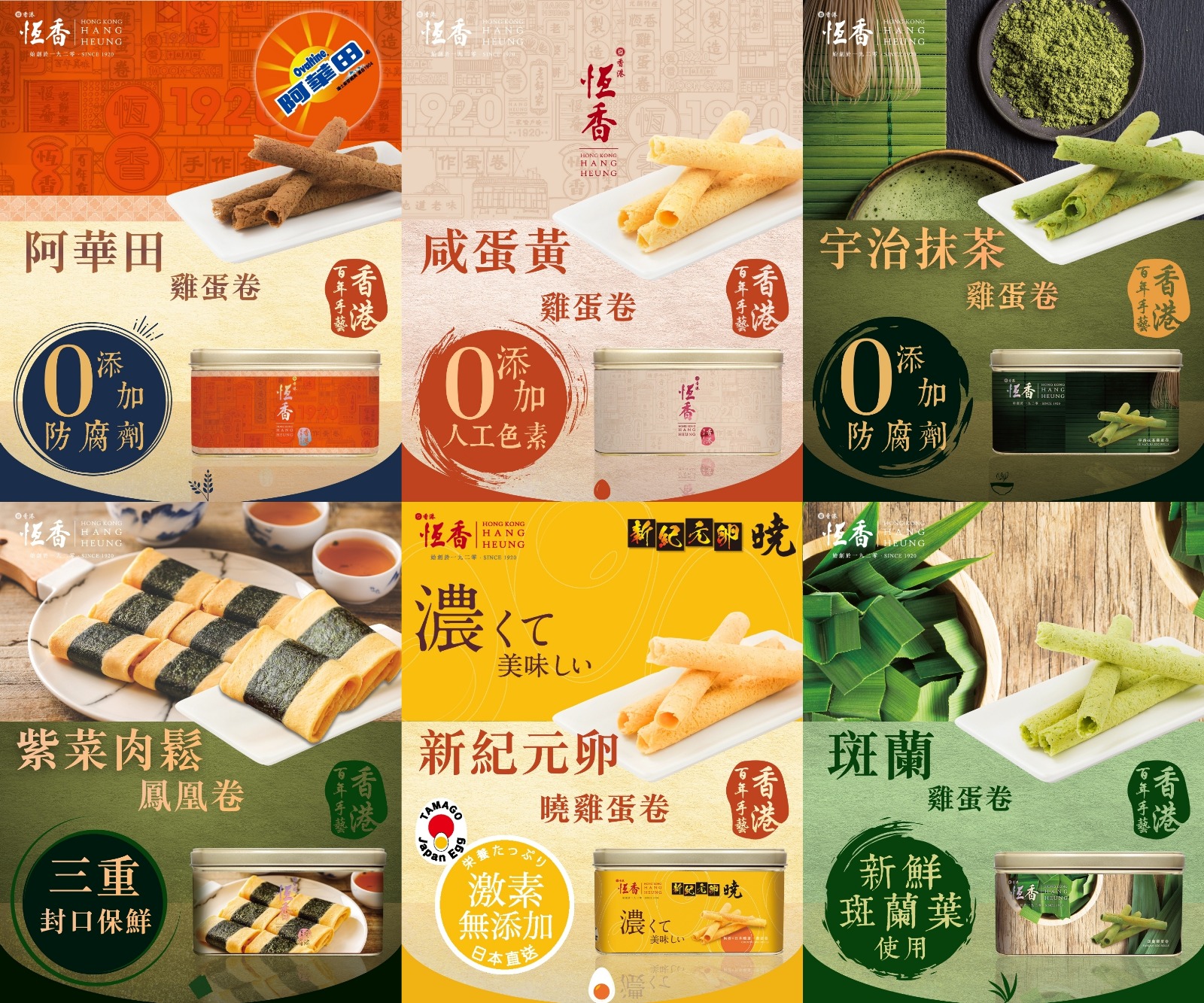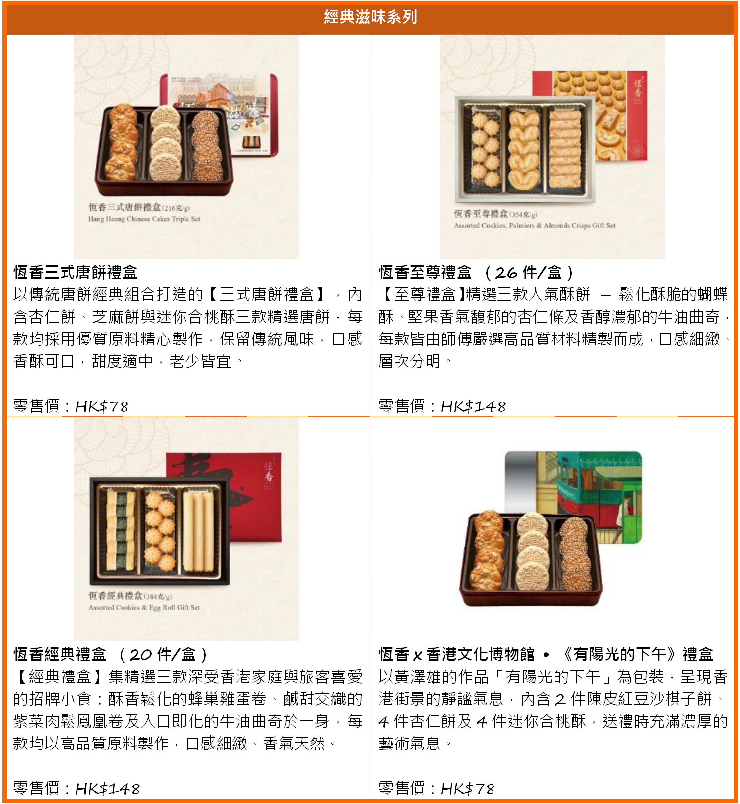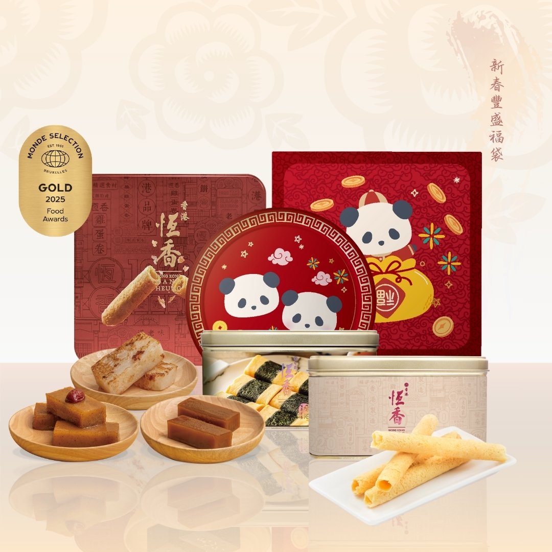 恒香老餅家賀年禮盒及雞蛋卷系列均設經典傳統或特色新味,當中賀年禮盒囊括全新「新年熊貓系列」以萌爆可愛造型配合喜慶設計,送禮一流;傳統的恒香經典禮盒及恒香至尊禮盒亦對是長輩至愛之選;而雞蛋卷系列主打無添加防腐劑及人工色素,亦是全港碩果僅存的人工手轆雙層手造雞蛋卷,更有多款新品包括:蛋香濃郁的日本新紀元·曉雞蛋卷、茶香清雅的宇治抹茶雞蛋卷及南洋芳香的斑蘭雞蛋卷、經典必搶紫菜肉鬆鳳凰卷等等,皆能為新春送禮及團圓時刻增添喜慶。