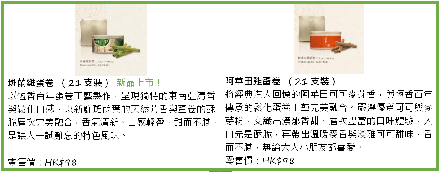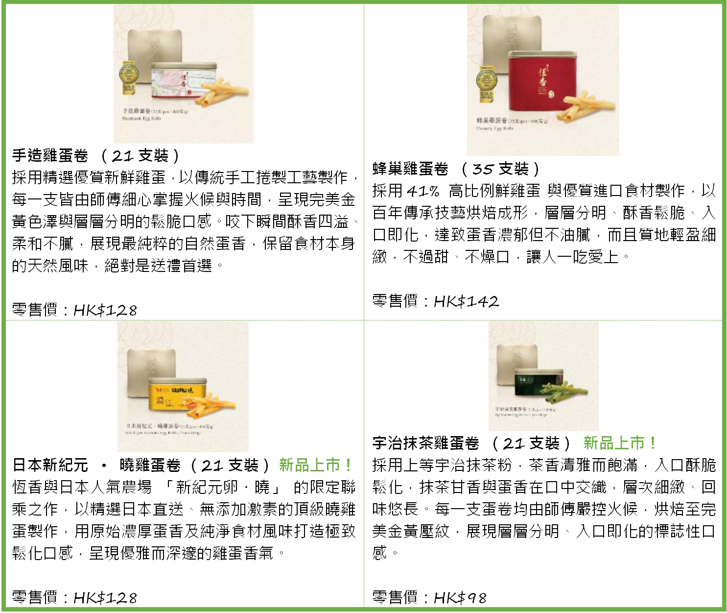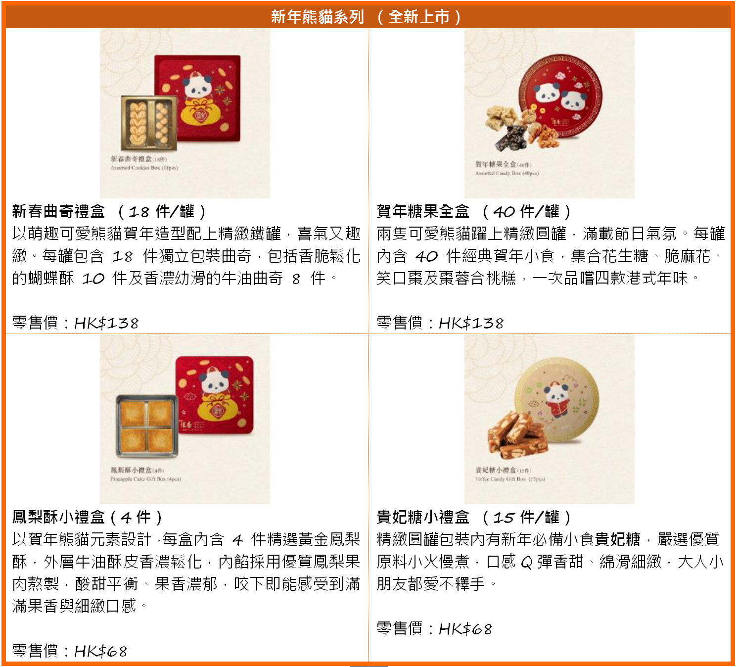 恒香老餅家賀年禮盒及雞蛋卷系列均設經典傳統或特色新味,當中賀年禮盒囊括全新「新年熊貓系列」以萌爆可愛造型配合喜慶設計,送禮一流;傳統的恒香經典禮盒及恒香至尊禮盒亦對是長輩至愛之選;而雞蛋卷系列主打無添加防腐劑及人工色素,亦是全港碩果僅存的人工手轆雙層手造雞蛋卷,更有多款新品包括:蛋香濃郁的日本新紀元·曉雞蛋卷、茶香清雅的宇治抹茶雞蛋卷及南洋芳香的斑蘭雞蛋卷、經典必搶紫菜肉鬆鳳凰卷等等,皆能為新春送禮及團圓時刻增添喜慶。