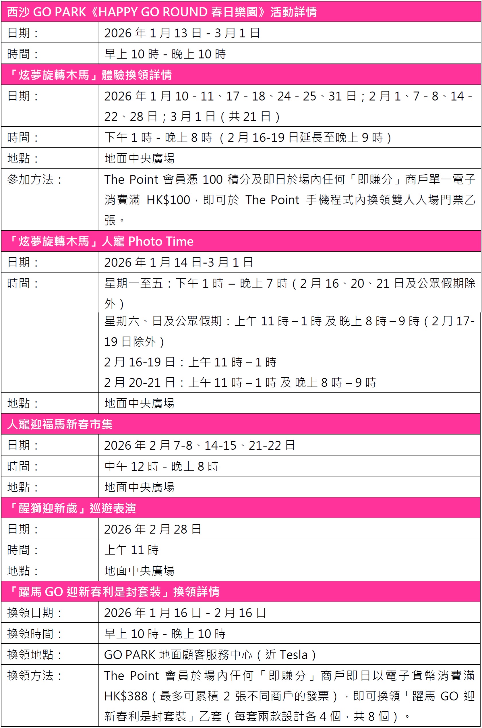 西沙GO PARK將於1月13日至3月1日呈獻新春主題活動《HAPPY GO ROUND春日樂園》,特別打造五大行運打卡位,包括西沙GO PARK戶外華麗蛻變的夢幻櫻粉色「炫夢旋轉木馬」及寓意步步生花的「桃花迎春步道」、二樓晴空花園內的寵物專區「寵愛花見陣」及旁邊映照歡樂時刻的「迎春花鏡庭園」,以及於GO PARK 2首度亮相的「緣轉風車台」,各裝置均以春日花卉為設計靈感,融合桃花、風車等吉祥元素,營造生機盎然的節日氛圍!