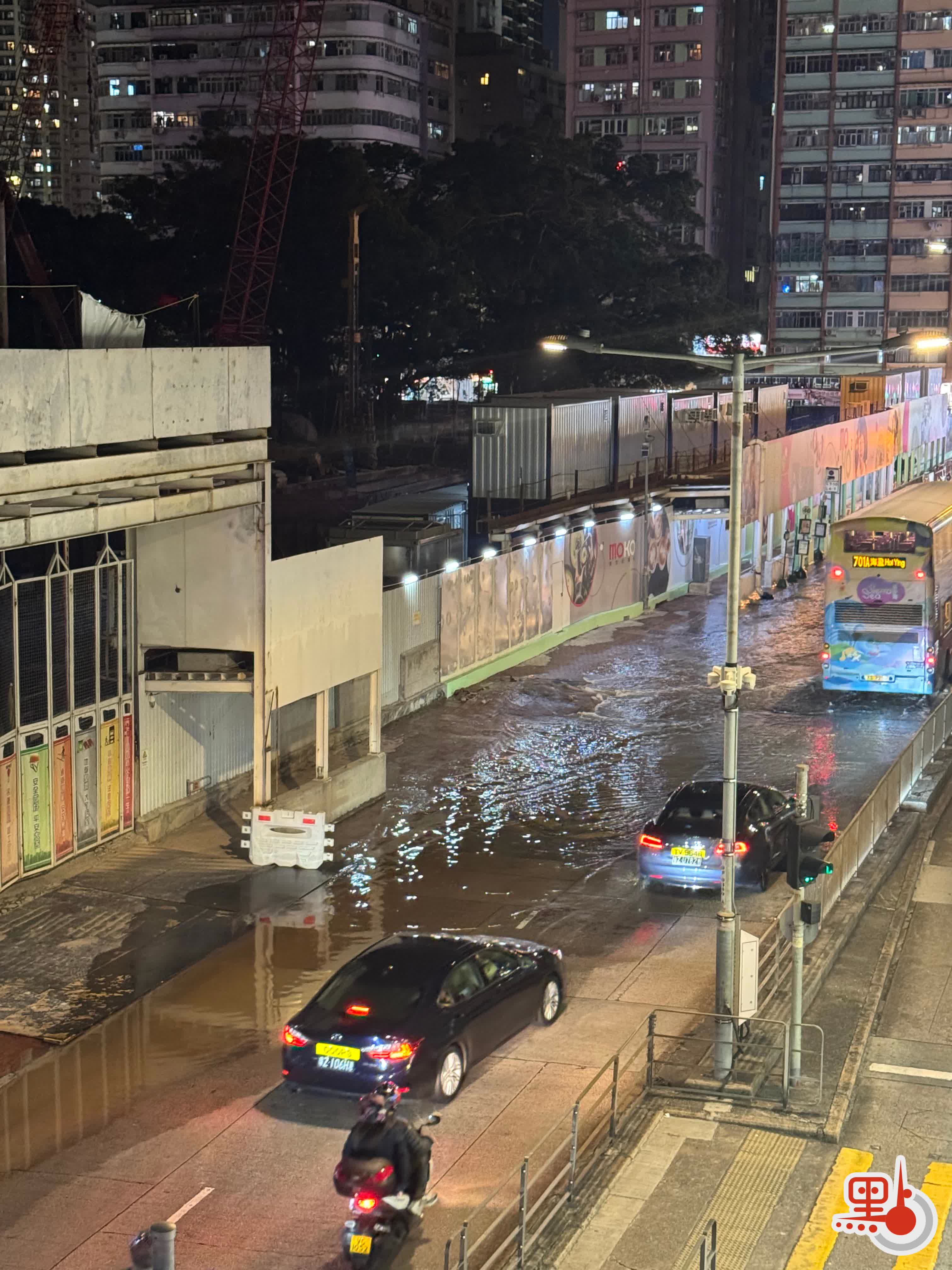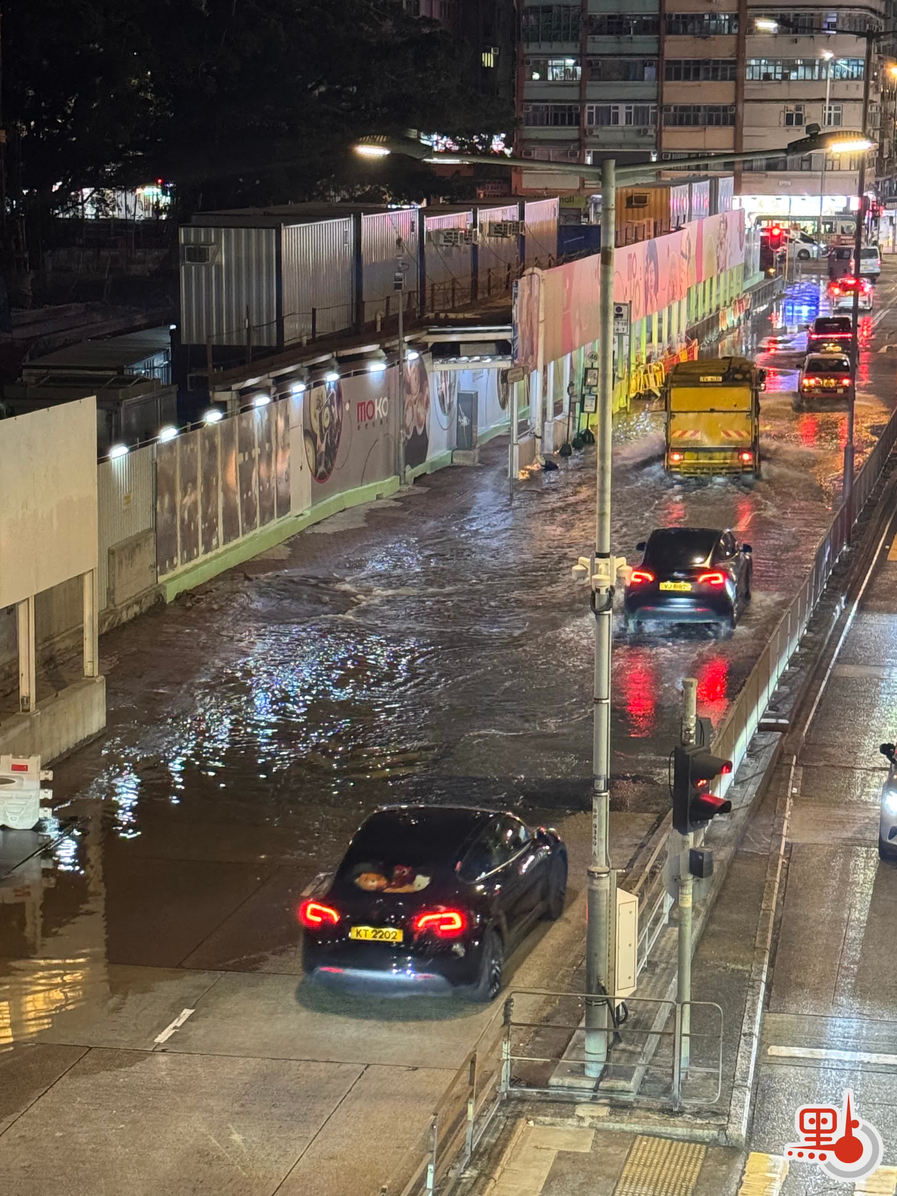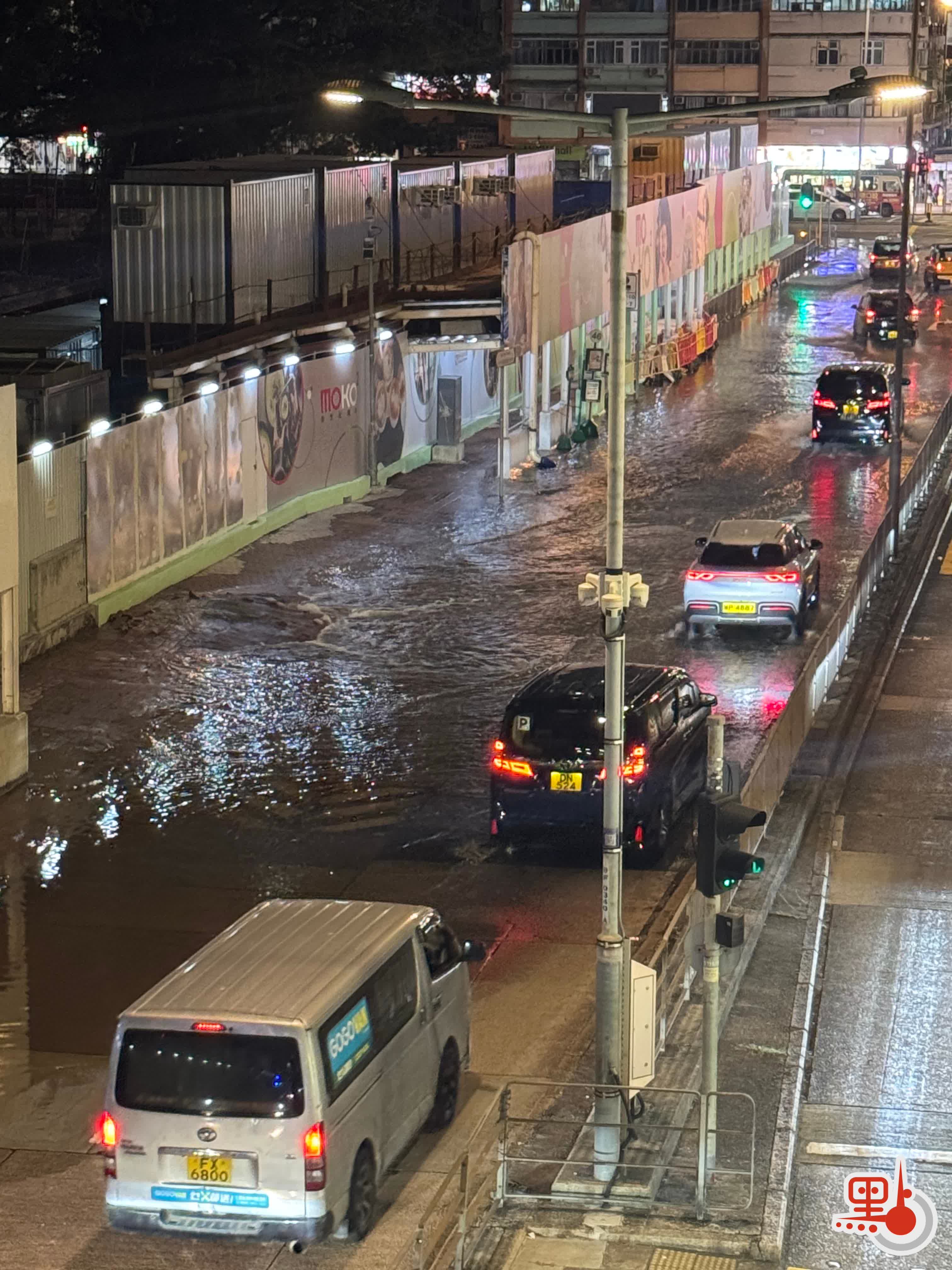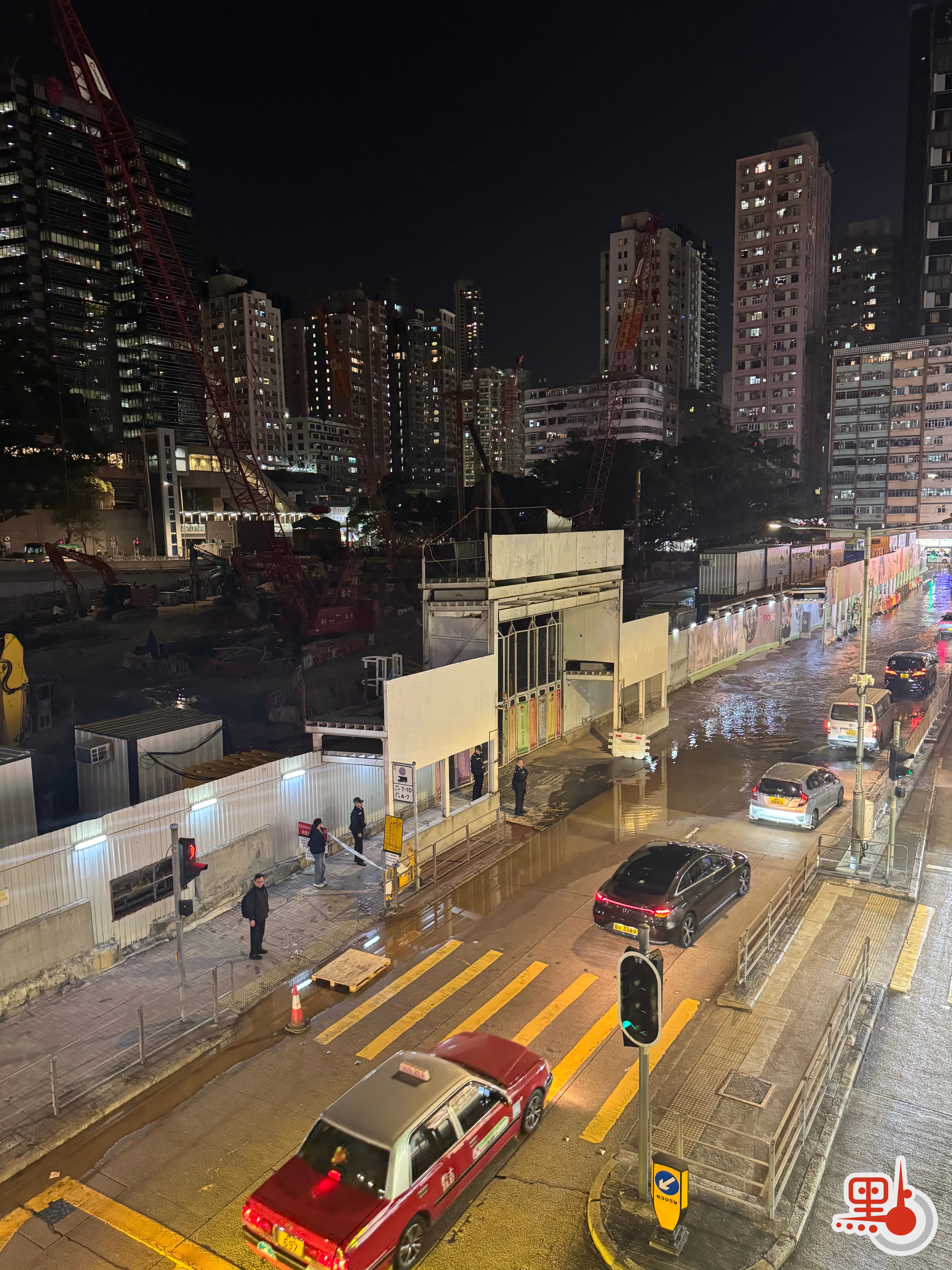 旺角洗衣街地盤門口爆水管 大量水湧出路面致水浸 車輛緩慢行駛