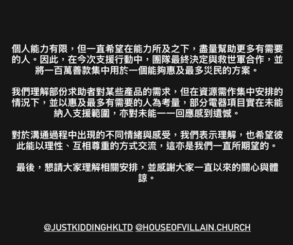 及後Tyson Yoshi就有關事件發出正式聲明:「個人能力有限,但一直希望在能力所及之下,盡量幫助更多有需要的人。因此,在今次支援行動中,團隊最終決定將一百萬善款集中用於一個能夠惠及最多災民的方案。我們理解部分求助者對某些產品的需求,但在資源需作集中安排的情況下,並以惠及最多有需要的人為考量,部分電器項目實在未能納入支援範圍,亦對未能一一回應感到遺憾。對於溝通過程中出現的不同情緒與感受,我們表示理解,也希望彼此能以理性、互相尊重的方式交流,這亦是我們一直所期望的。最後,懇請大家理解相關安排,並感謝大家一直以來的關心與體諒。」