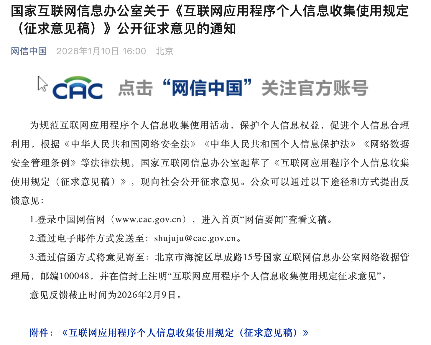 【點新聞報道】據央視新聞報道,國家互聯網信息辦公室起草了《互聯網應用程序個人信息收集使用規定(徵求意見稿)》,今起(10日)向社會公開徵求意見。