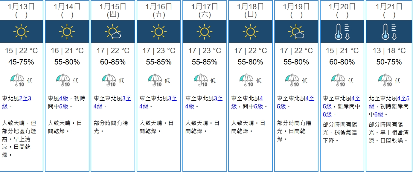 天文台預料,一股強烈東北季候風會在下周中期抵達華南,該區氣溫下降。根據天文台今日公布的本港九天天氣預測,下周二(20日)起本港會再度降溫,當日正值節氣大寒,預料低見15℃。下周三(21日)預料進一步跌至13℃,日間乾燥。