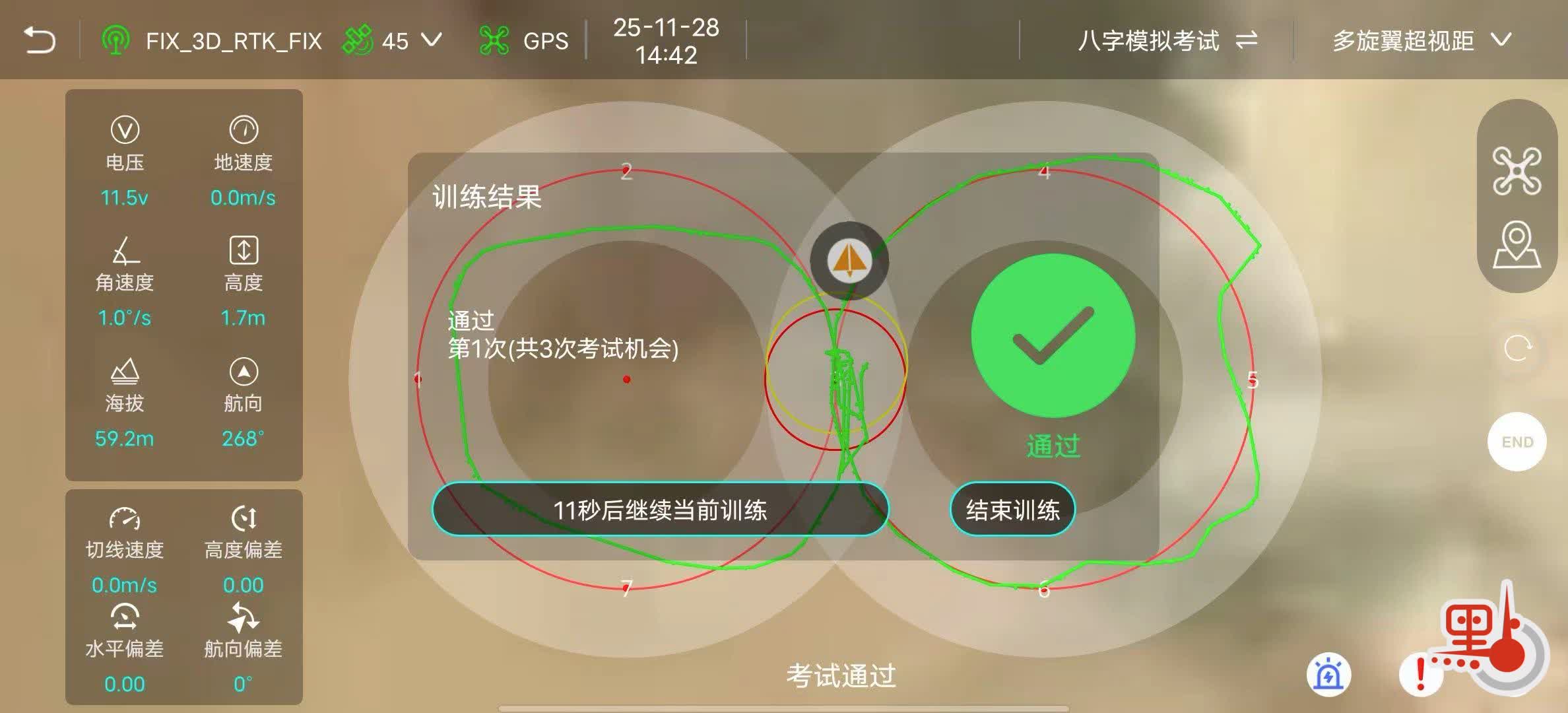 第三關是實操,即是你要控制圖中的訓練機,以姿態模式,在1分鐘內自旋一圈。然後再用3分鐘時間,飛行一個8字。這一關是由裝在訓練機底部的電子椿內判定的(請看附圖)。若你的自旋和8字飛行超越左右共2米範圍,即角度太大,那你便下次請早。這關不用等28天,14天後便可以重考。