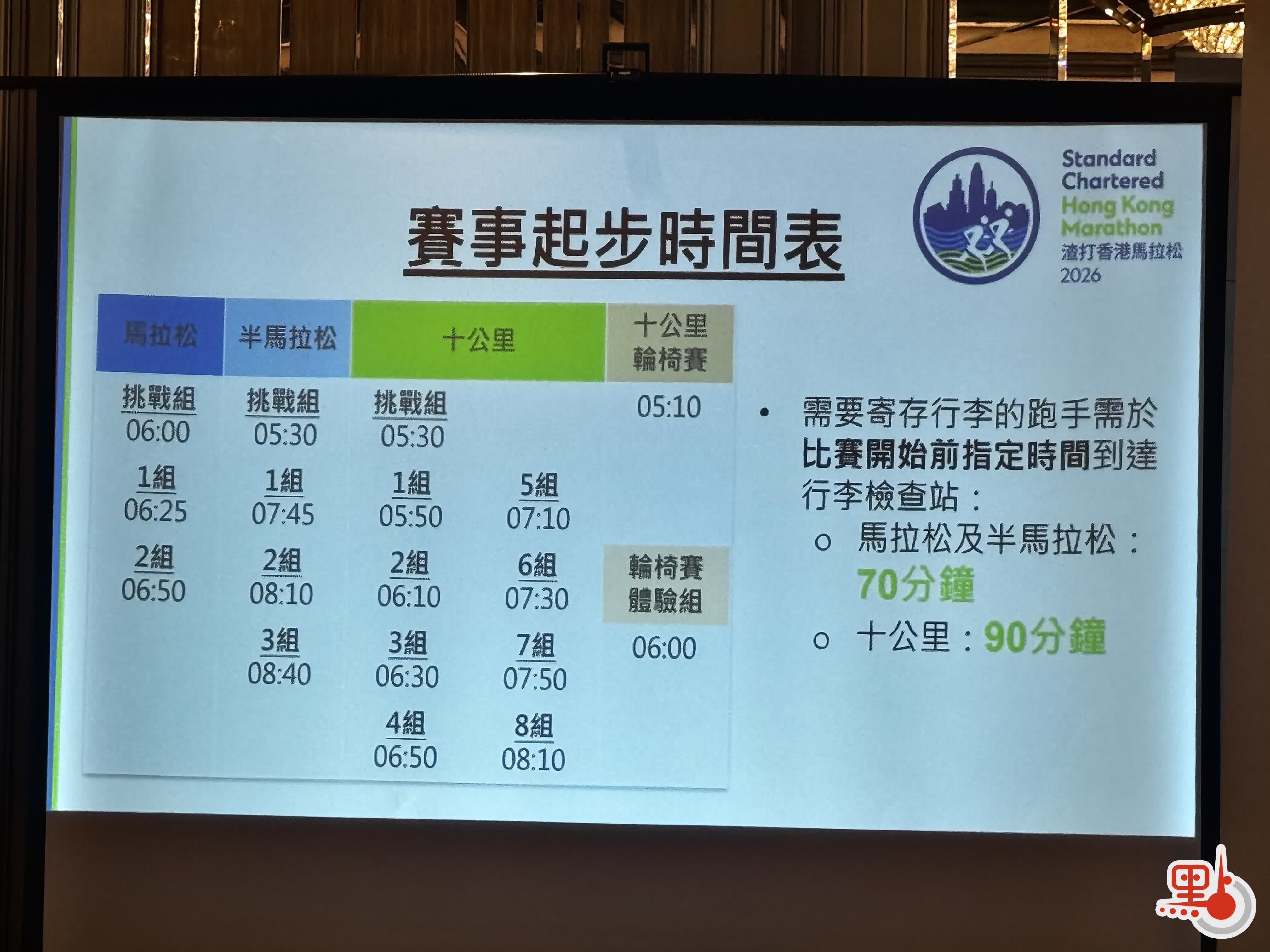 大會指,需要寄存行李的全馬及半馬跑手需於比賽開始前70分鐘到達行李檢查站,10公里賽跑手則需於比賽開始前90分鐘到達。比賽當日溫度預計介乎17至22度,濕度則介乎55%至80%,大致天晴,日間乾燥。