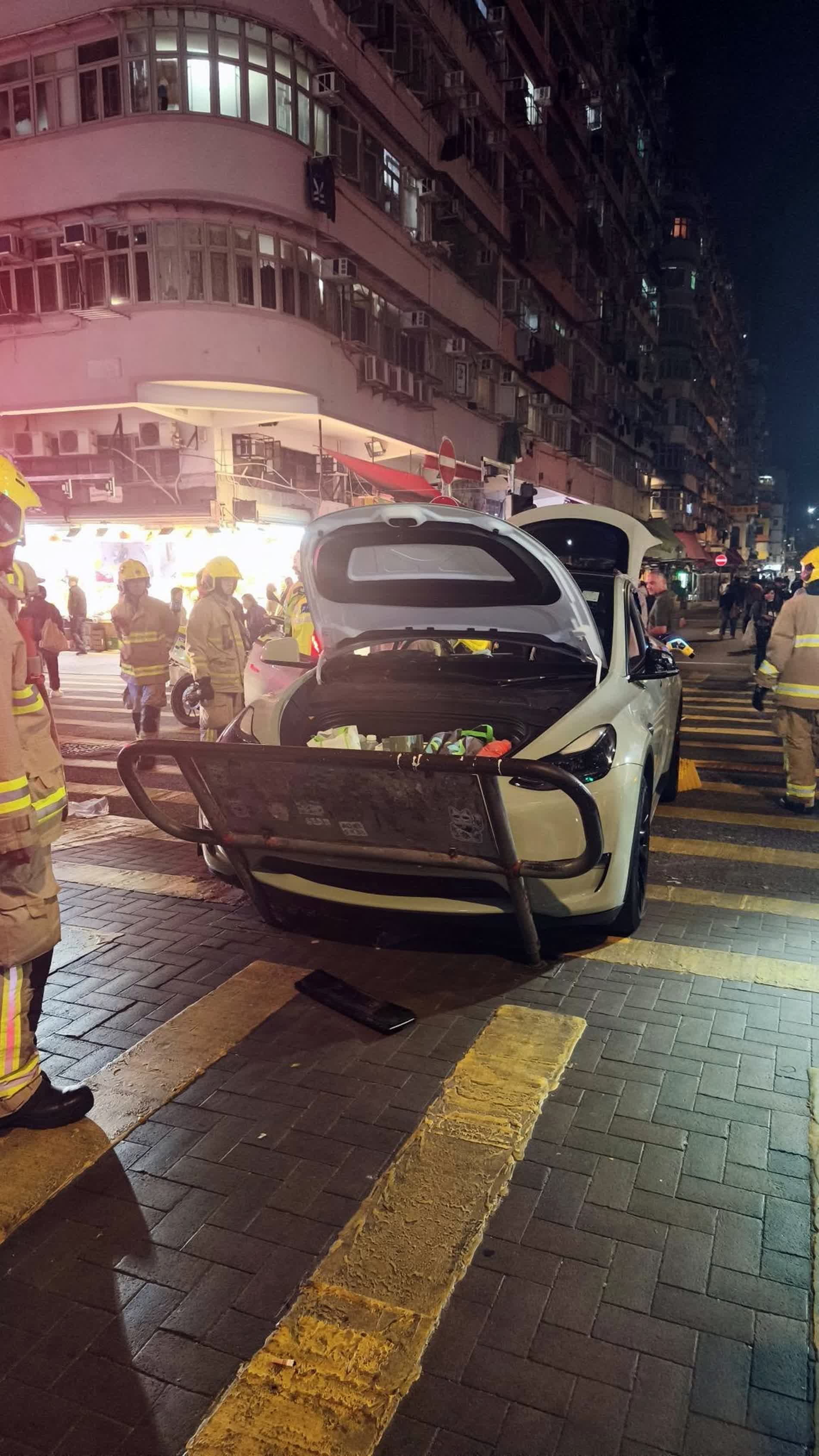 現場所見,失事的Tesla電動私家車撞向路中分隔馬路及行人專用區的鐵欄。消防員則用應急插頭及車輪膠頂固定車身,以免電動車再次失控。事件仍在調查中。