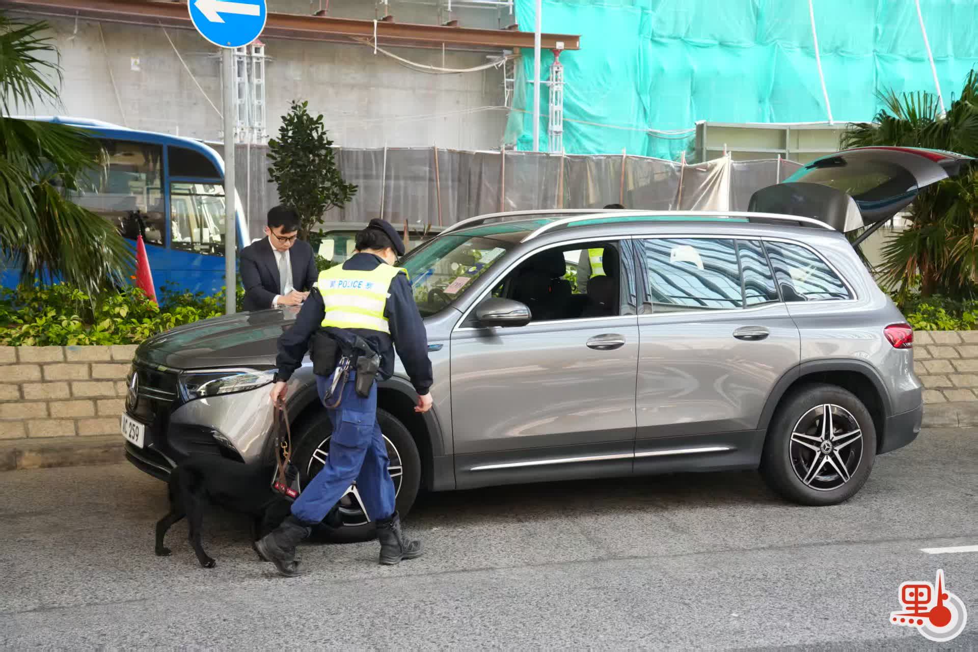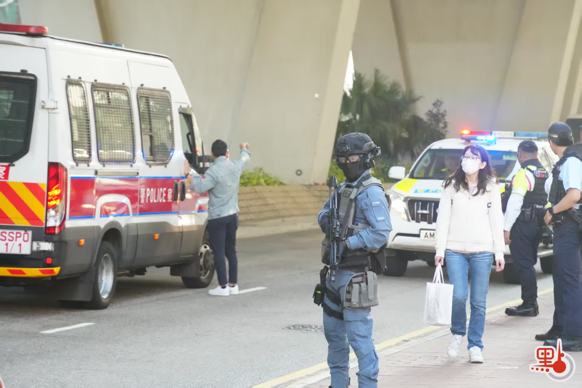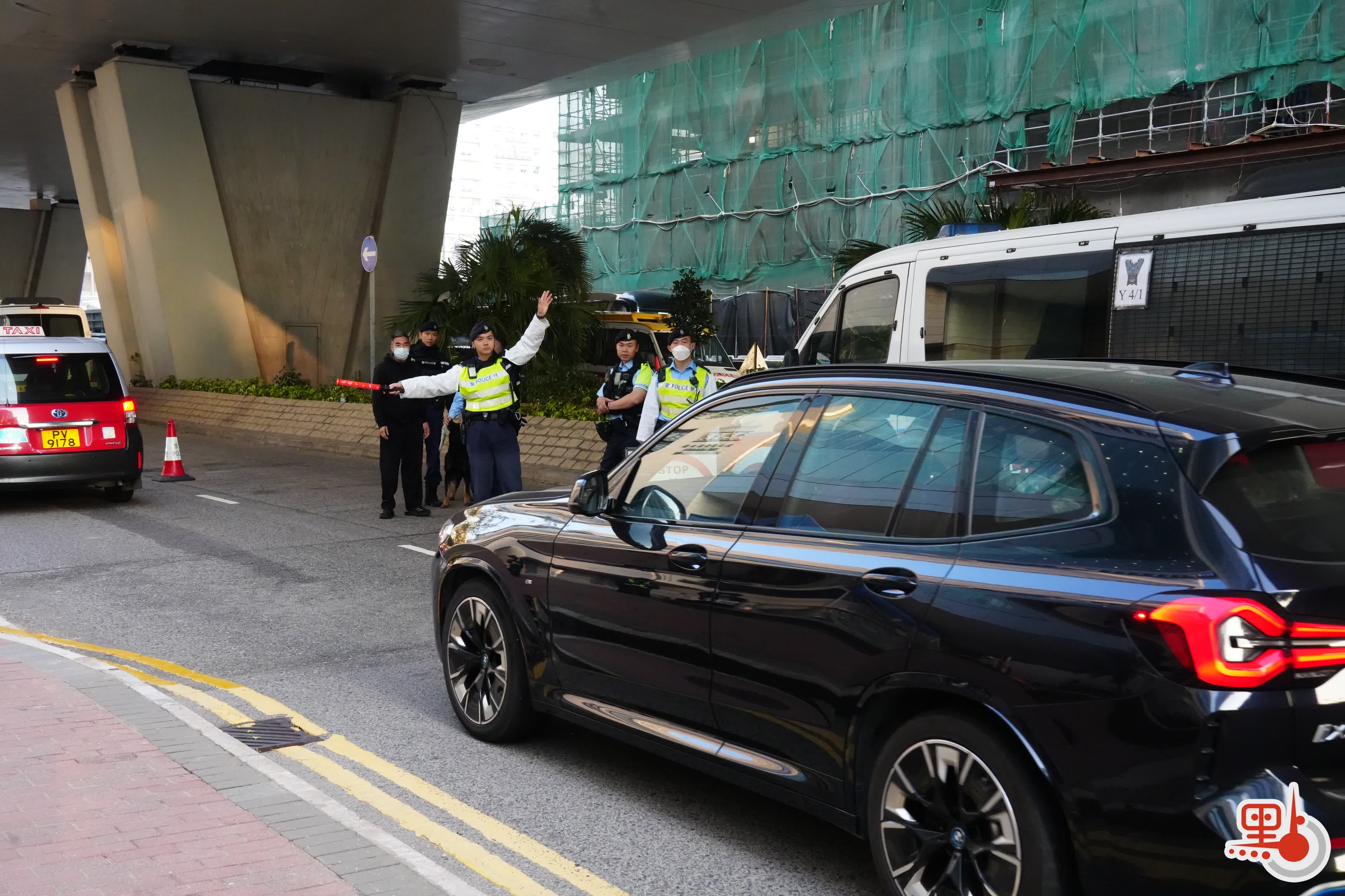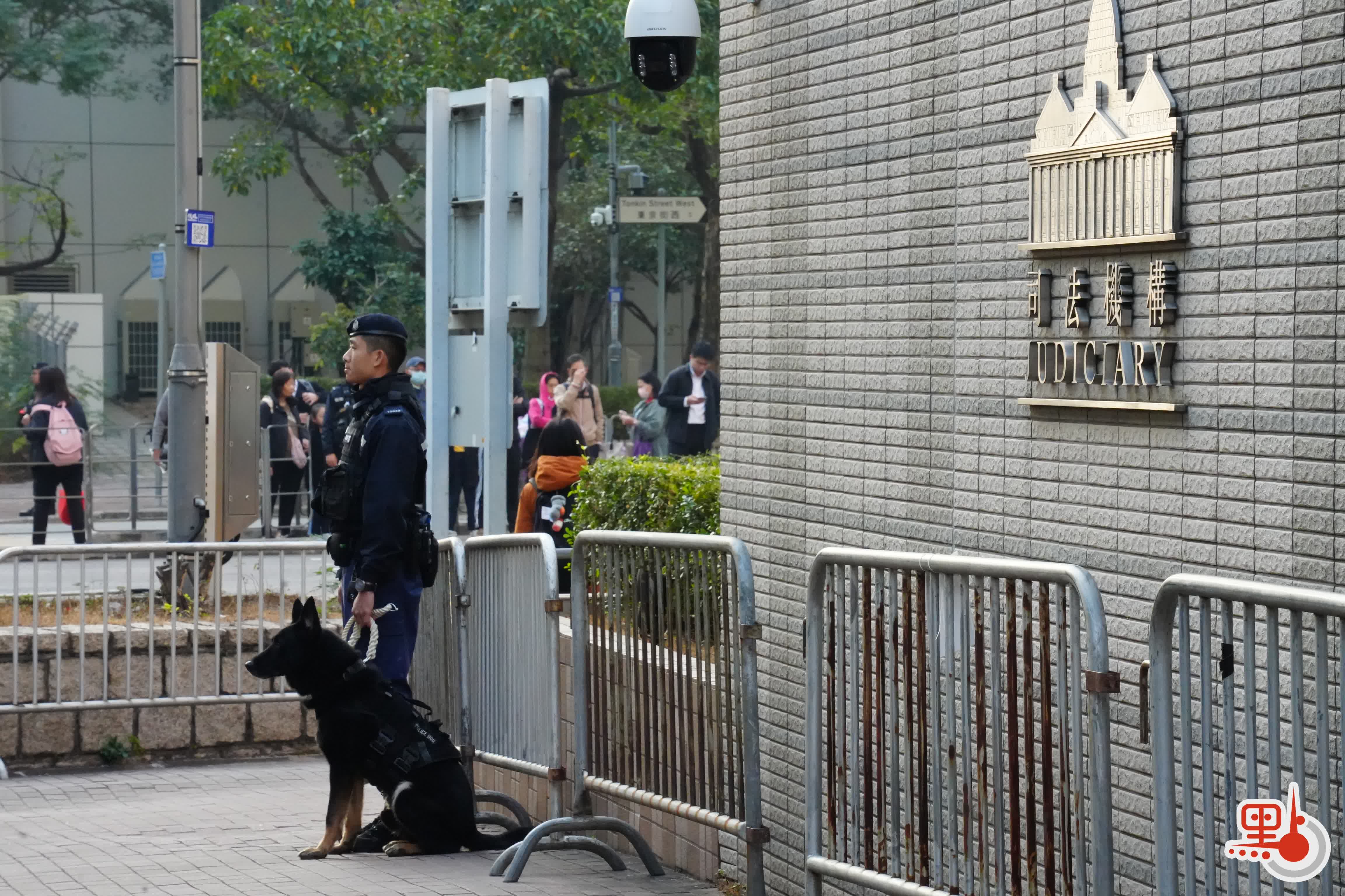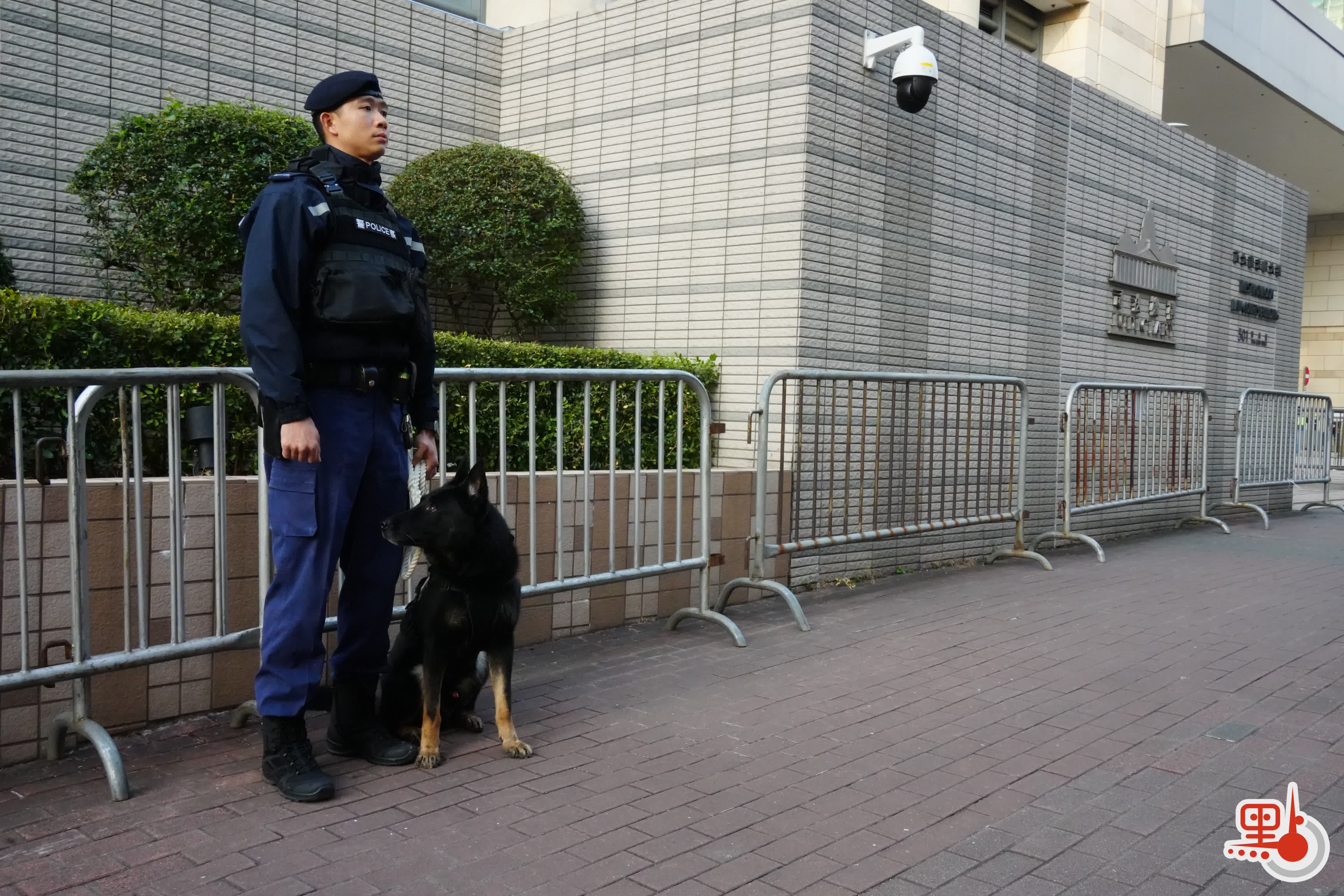 【點新聞報道】黎智英案今日(13日)進入被告求情階段第二天審訊。法院外保安措施顯著加強,數十名穿着防刺戰術背心的警員在場巡邏,而位於通州街天橋底的行車線停泊多架警方車輛,包括裝甲車「劍齒虎」。與此同時,警方亦設置路障,所有進入法庭的車輛,均需接受安檢,例如,通過爆炸品搜索犬、金屬探測儀器以及反光鏡檢查車底。