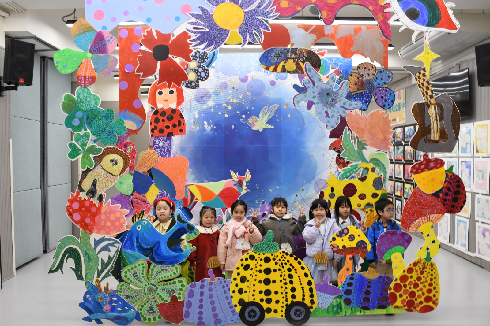 禮堂內除了殿堂級真跡外,更陳列各年級師生合力創作的「大師級」作品。其中最矚目的「唔係吖!?真實定幻境?」大型藝術裝置,由多個年級學生耗時兩個月精心拼湊而成,靈活運用草間彌生的經典波點、無限網,以及畢加索的立體派解構、靜態掃描、版畫等元素,成為全場拍照打卡焦點。