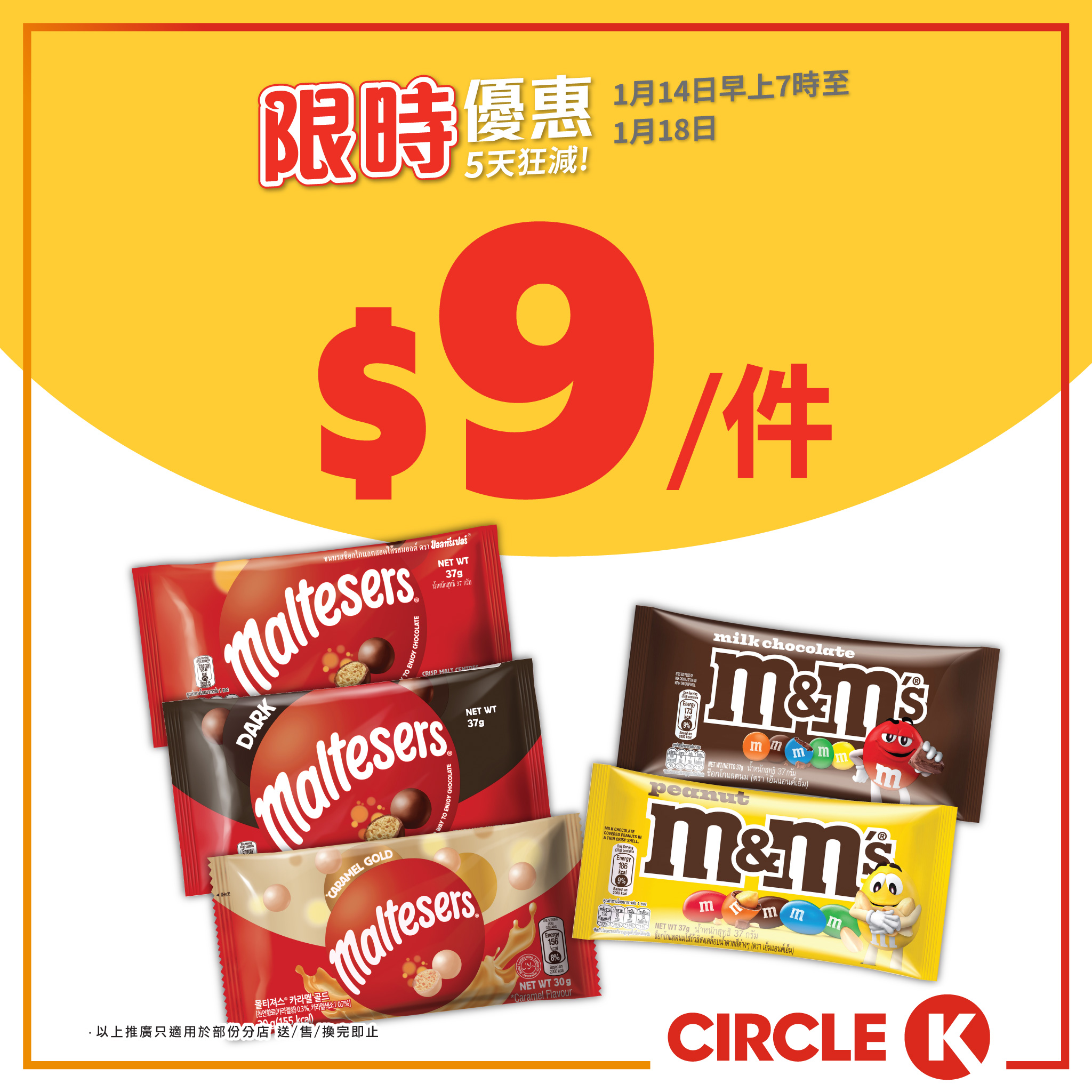 當中雀巢MEGA雪糕批/能得利$47/6件;M&M's及麥提莎袋裝(30-40克)$9/件;佳得樂運動飲品600毫升$10/件;維他冷泡無糖茶飲品500毫升$10.5/件,加1蚊即可多得1件;藍冰/雪花勇闖天涯、青島純生啤酒500毫升$10/2件。