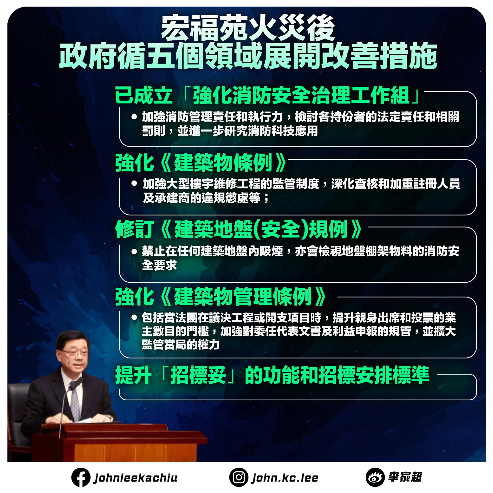 李家超指出,在獨立委員會積極進行工作的同時,政府會刻不容緩展開不同領域改善措施,包括(一)已成立「強化消防安全治理工作組」,加強消防管理責任和執行力,檢討各持份者的法定責任和相關罰則,並進一步研究消防科技應用;(二)強化《建築物條例》,加強大型樓宇維修工程的監管制度,深化查核和加重註冊人員及承建商的違規懲處等;(三)加強工地安全,修訂《建築地盤(安全)規例》,禁止在任何建築地盤內吸煙,亦會檢視地盤棚架物料的消防安全要求;(四)強化《建築物管理條例》,包括當法團在議決工程或開支項目時,提升親身出席和投票的業主數目的門檻,加強對委任代表文書及利益申報的規管,並擴大監管當局的權力;以及(五)提升「招標妥」的功能和招標安排標準。另外,就受影響家庭的長遠居住安排,政府將在今日立法會會議上動議議案並提出考慮建議,既考慮受影響家庭的意願,亦考慮善用資源,要情、理、法兼備。