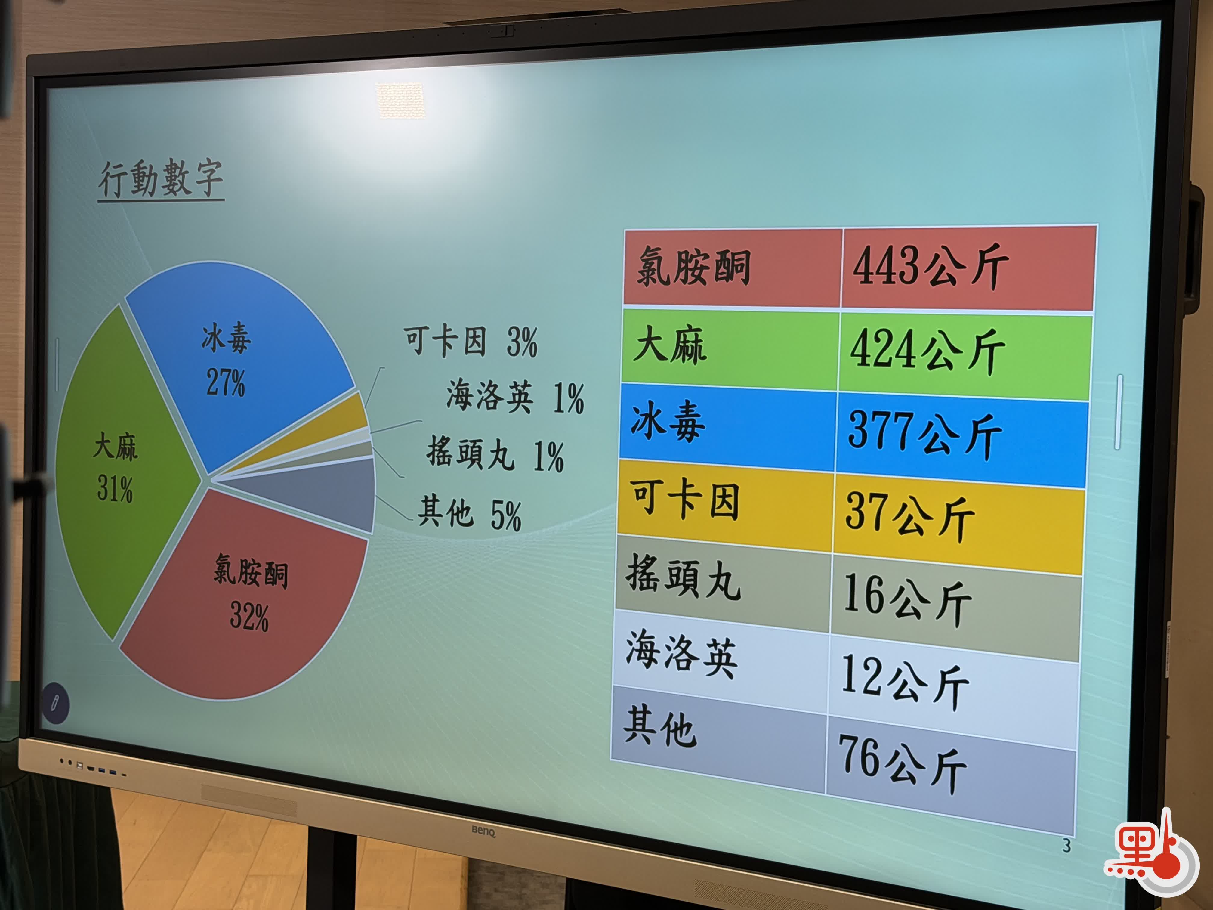 海關毒品調查科機場調查課監督黃雅綸指,不法分子利用年末旅遊高峰期、長假期客流較多,以空運方式向香港運送毒品。經過3個月聯合行動,成功偵破183宗案件,其中經客運40宗,貨運則143宗。聯合行動中,海關共檢獲約1.4噸懷疑毒品,其中懷疑氯胺酮、懷疑大麻及懷疑冰毒位列前三,分別檢獲443公斤、424公斤、及377公斤,市值約4.31億港元。行動共拘捕62人,年齡介乎19歲至77歲,一半為內地及香港本地人士,其餘均為不同國籍的外籍人士。