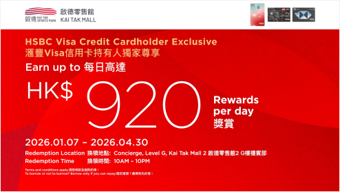 啟德體育園消費獎賞停不了!即日起至4月30日,憑滙豐Visa信用卡於啟德零售館、啟德體藝館、運動健康中心及美食海灣之商戶簽賬,每日可享合共高達港幣$920獎賞及精選商戶禮遇。