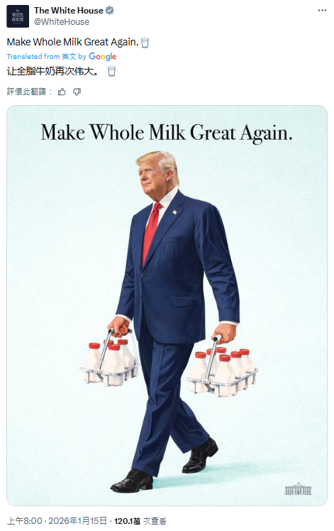 隨後,白宮在社交媒體寫到:「Make Whole Milk Great Again.」(讓全脂牛奶再次偉大),並配以特朗普手拎牛奶的圖片。
