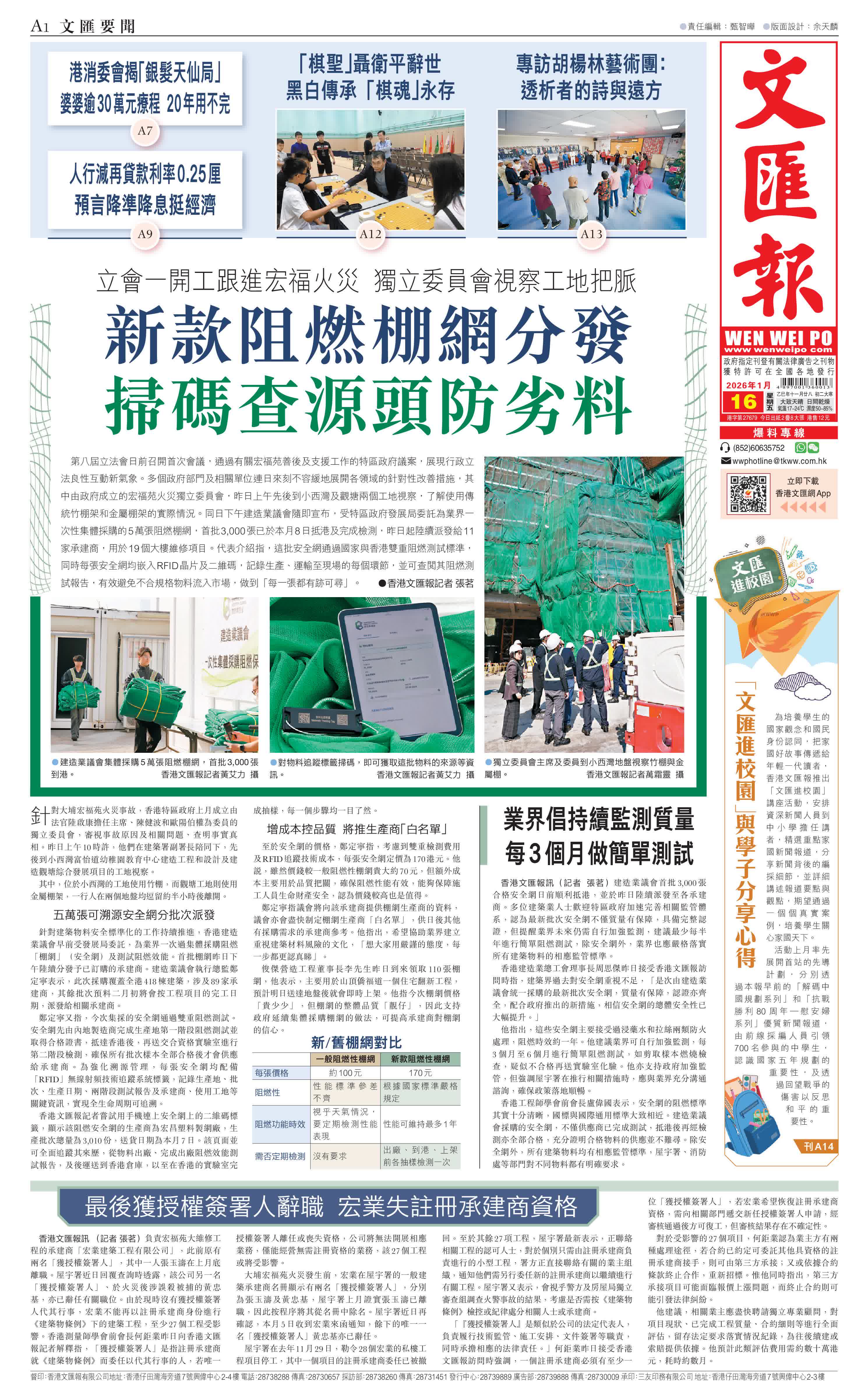 第八屆立法會日前召開首次會議,通過有關宏福苑善後及支援工作的特區政府議案,展現行政立法良性互動新氣象。多個政府部門及相關單位連日來刻不容緩地展開各領域的針對性改善措施,其中由政府成立的宏福苑火災獨立委員會,昨日上午先後到小西灣及觀塘兩個工地視察,了解使用傳統竹棚架和金屬棚架的實際情況。同日下午建造業議會隨即宣布,受特區政府發展局委託為業界一次性集體採購的5萬張阻燃棚網,首批3,000張已於本月8日抵港及完成檢測,昨日起陸續派發給11家承建商,用於19個大樓維修項目。代表介紹指,這批安全網通過國家與香港雙重阻燃測試標準,同時每張安全網均嵌入RFID晶片及二維碼,記錄生產、運輸至現場的每個環節,並可查閱其阻燃測試報告,有效避免不合規格物料流入市場,做到「每一張都有跡可尋」。