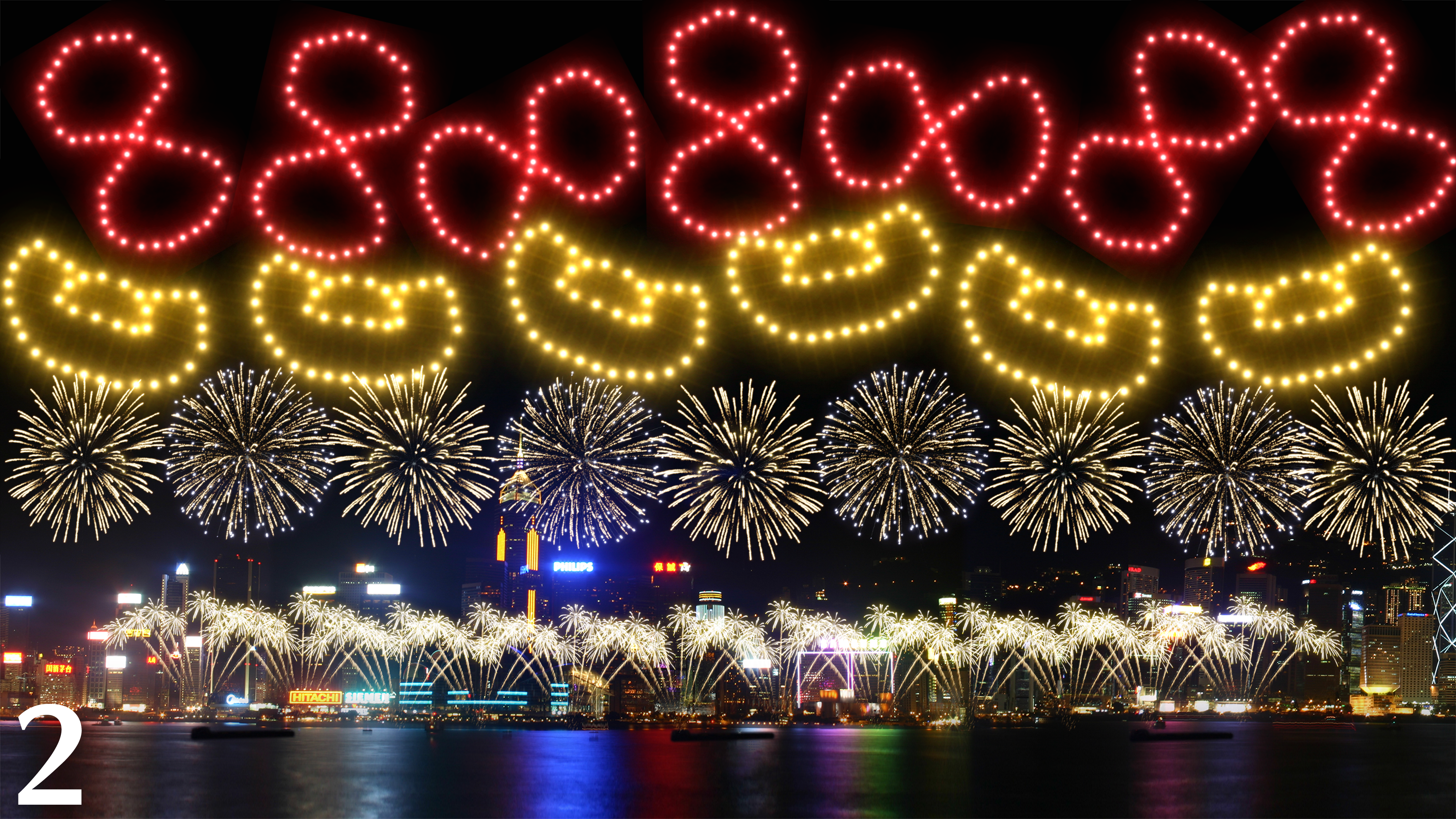 新年新氣象,維港上空綻放「8」字型禮花彈與「金元寶」造型煙花,寓意財源廣進。煙花如金雨灑滿香江,祝願全港市民在馬年家肥屋潤、丁財兩旺,一同迎接新氣象。