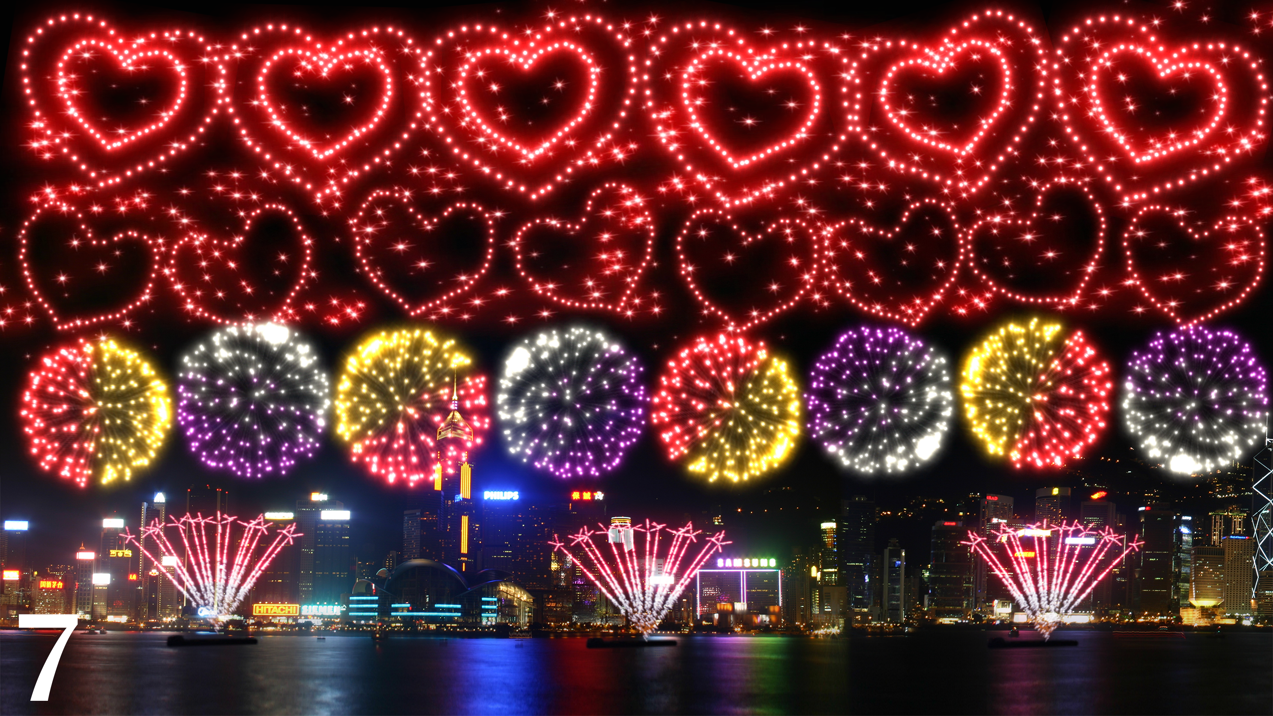 以滿天心形禮花彈展現市民對香港的深情,象徵大家同心同德,在馬年攜手奔向更美好的明天。交錯綻放的煙花寓意你我共同參與,各界攜手合作共贏,一同為城市開拓新機遇、打造多姿多彩的未來。