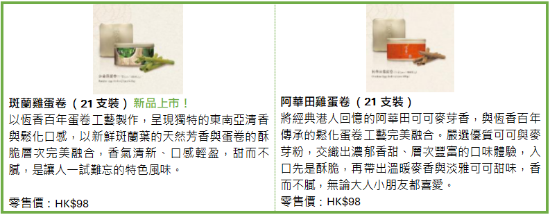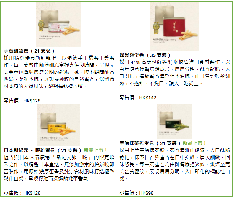 新歲伊始,恒香特意準備嶄新口味的恒香老餅家賀年禮盒及雞蛋卷系列均設經典傳統或特色新味,當中賀年禮盒囊括全新「新年熊貓系列」以萌爆可愛造型配合喜慶設計;雞蛋卷系列主打無添加防腐劑及人工色素,亦是全港碩果僅存的人工手轆雙層手造雞蛋卷。更有多款新品,包括蛋香濃郁的日本新紀元·曉雞蛋卷、茶香清雅的宇治抹茶雞蛋卷及南洋芳香的斑蘭雞蛋卷、經典必搶紫菜肉鬆鳳凰卷等。