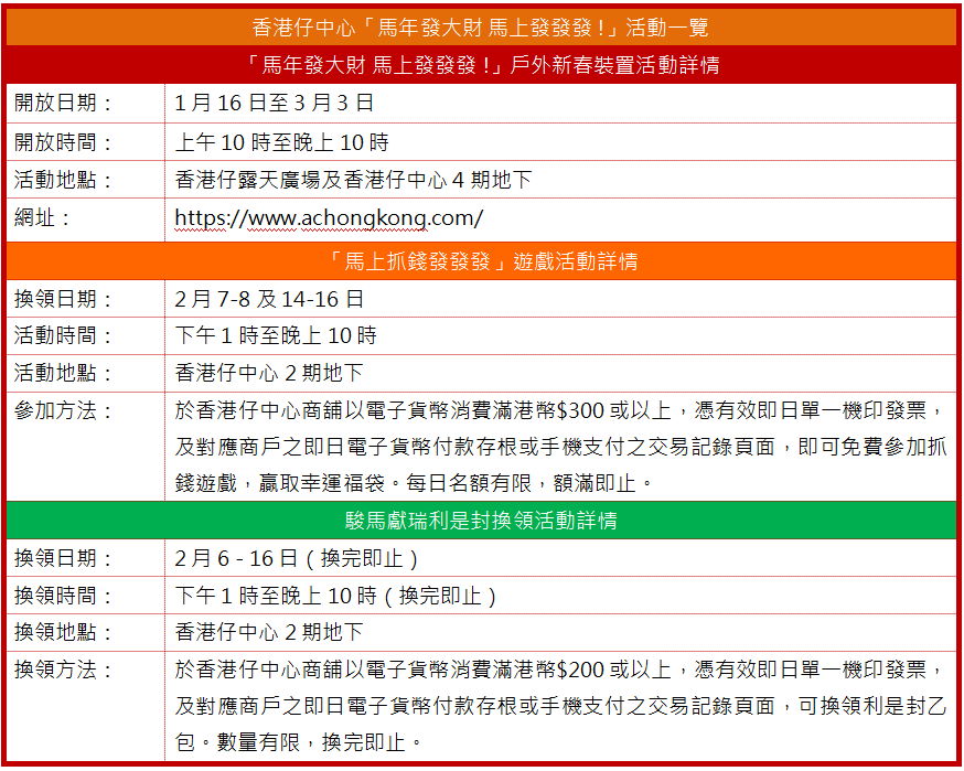 香港仔中心亦將趁佳節送上2大「好運滿馬」雙重消費禮遇!2月7-8及14-16日憑消費即可免費參加抓錢遊戲,贏取幸運福袋;2月6-16日,憑消費更可換領駿馬獻瑞利是封。