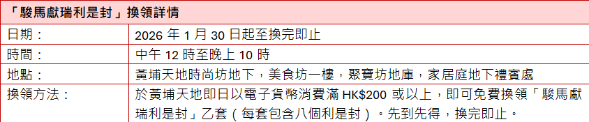 與此同時,黃埔天地精心準備了「駿馬獻瑞利是封」,選用象徵吉祥與熱情的緋紅為底色,上面以金色流線勾勒出一頭躍然奔騰、氣勢非凡的祥馬剪影。由1月30日起,於黃埔天地即日以電子貨幣消費滿HK$200或以上,即可免費換領「駿馬獻瑞利是封」乙套(每套包含8個利是封),先到先得,換完即止。