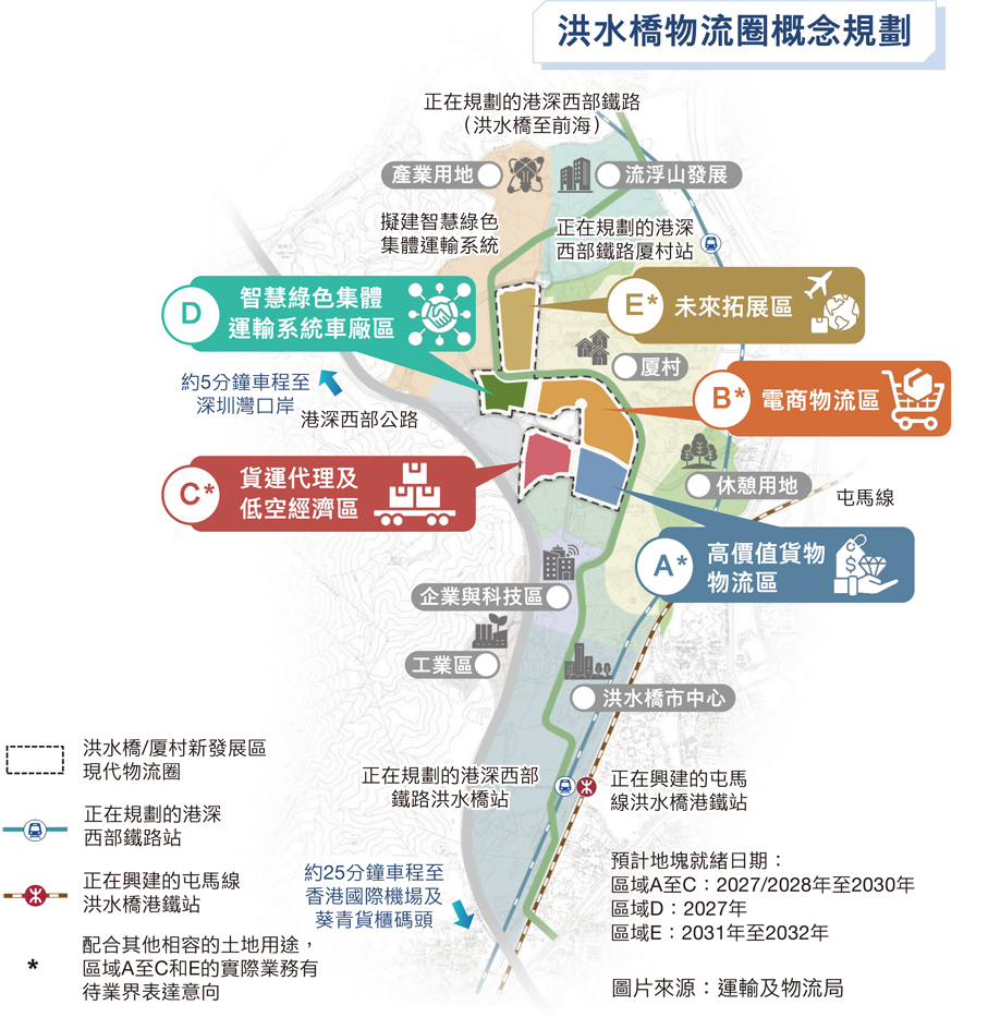 香港近年持續鞏固和提升作為國際航運中心及物流樞紐的地位,特區政府運輸及物流局昨日公布洪水橋/厦村新發展區現代物流圈的規劃研究報告,為該區物流圈制定概念性發展規劃。報告建議36公頃用地大致分為5區發展,並確立「企業為本」、「締造有利市場環境」、「創新方式驅動行業發展」三大發展方向,下設「吸引錨點企業」、「多元化發展模式」等六項措施,為企業提供一系列量身定製的優惠政策與彈性措施,切合業界所需。運輸局局長陳美寶昨日特別指出,今年內會爭取就首幅位於錫降圍路的用地,邀請業界提交發展意向書,局方估計有關用地最快可於2027/2028年就緒,期望2028年有企業進駐發展。