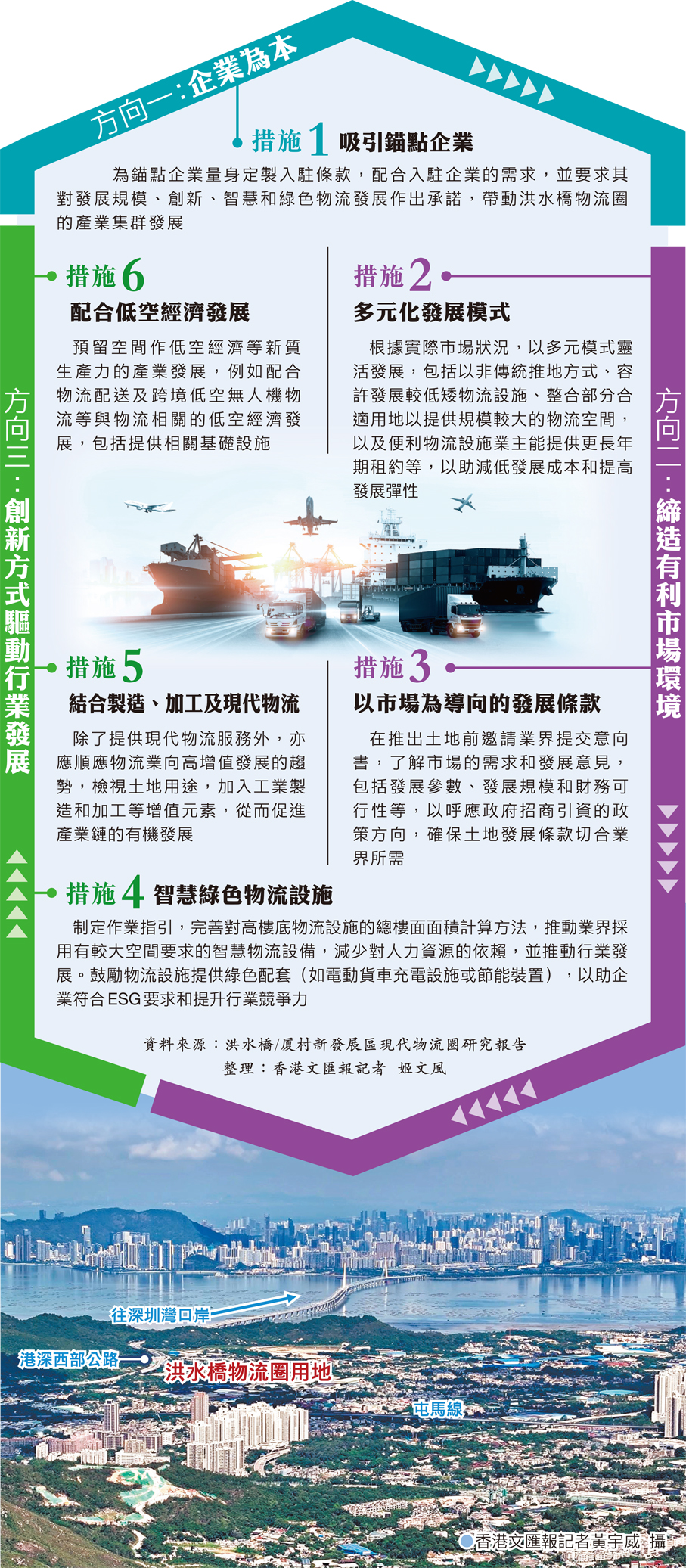 同時,經收集業界持份者的不同意見,以及參考了內地及海外經驗和香港實際情況。報告為洪水橋物流圈確立了三大發展方向,下設六項措施。三大方向包括以企業為本,建議為錨點企業量身定製入駐條款,並要求企業對發展規模、創新、智慧和綠色物流發展作出承諾。