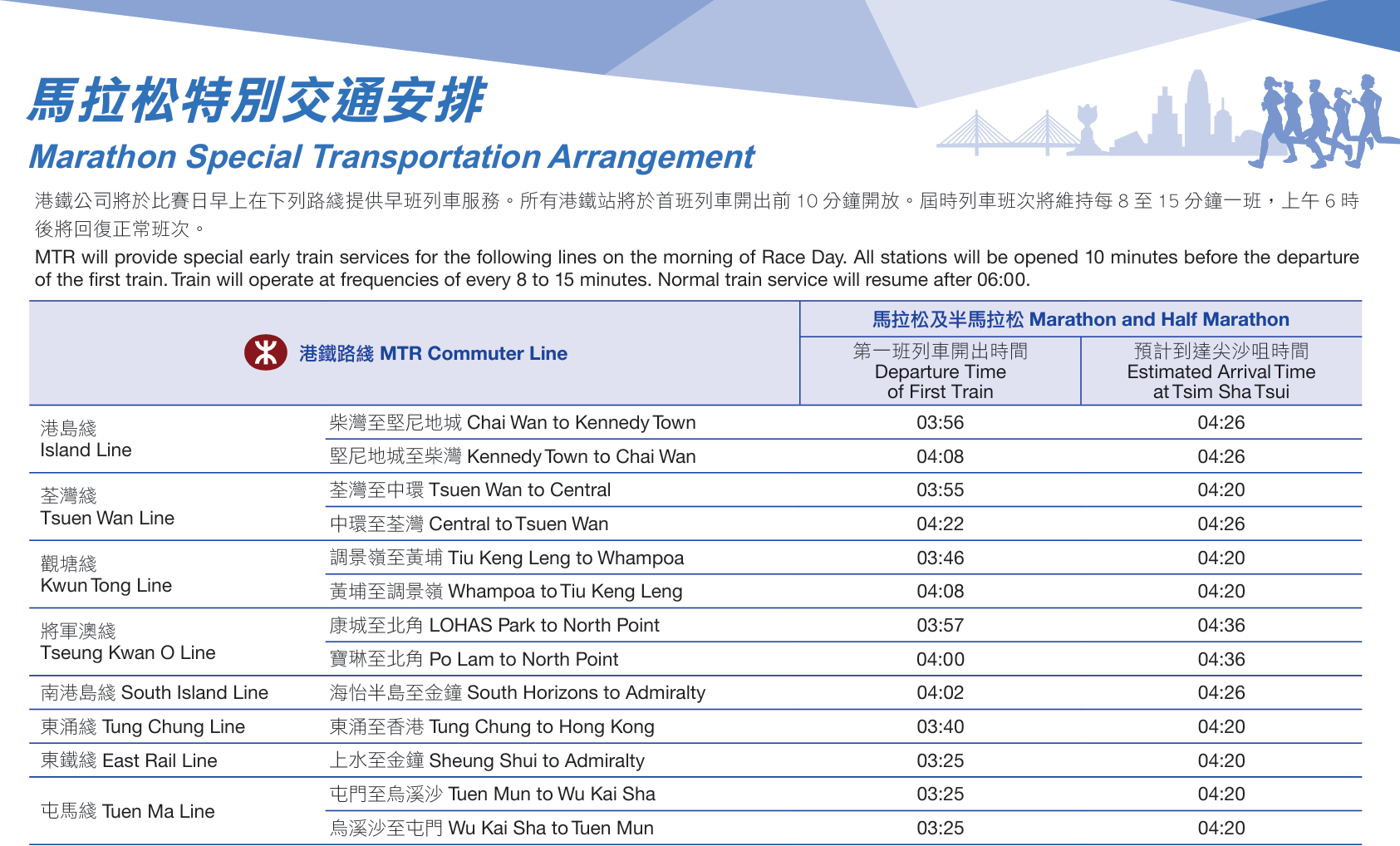 為方便跑手出行,九巴明日開辦22條特別路線,由多區接載選手前往起點;城巴亦特設9條馬拉松專線,便利健兒由各區前往賽場。此外,港鐵8條鐵路綫明日提早開出頭班車,其中屯馬綫及東鐵綫(上水往金鐘方向)的頭班車最早於凌晨3時25分開出,以配合賽事安排。點新聞為你梳理交通攻略,助你贏在起跑線!