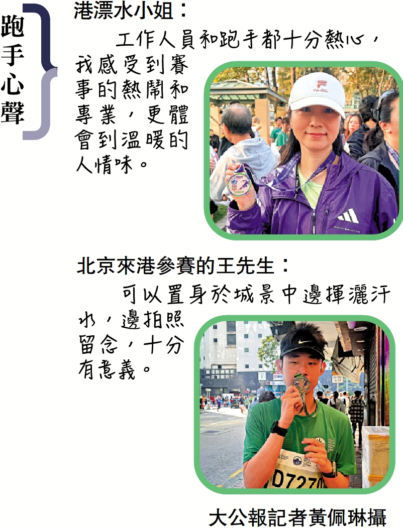 來自北京的王先生第一次參加正式的馬拉松賽事,笑言跑半馬「又快樂又痛苦」。「痛苦」在於真正領略到了「魔鬼賽道」的威力,「跑完只想回酒店大睡一覺」;而開心的是路旁不斷有觀眾打氣,還可沿途欣賞美麗的風景。他平時喜歡攝影,一直認為香港街道的建築、風景很有質感。參加香港渣馬,他可置身於城景中邊揮灑汗水,邊拍照留念,十分有意義,更可近距離地感受香港的魅力。