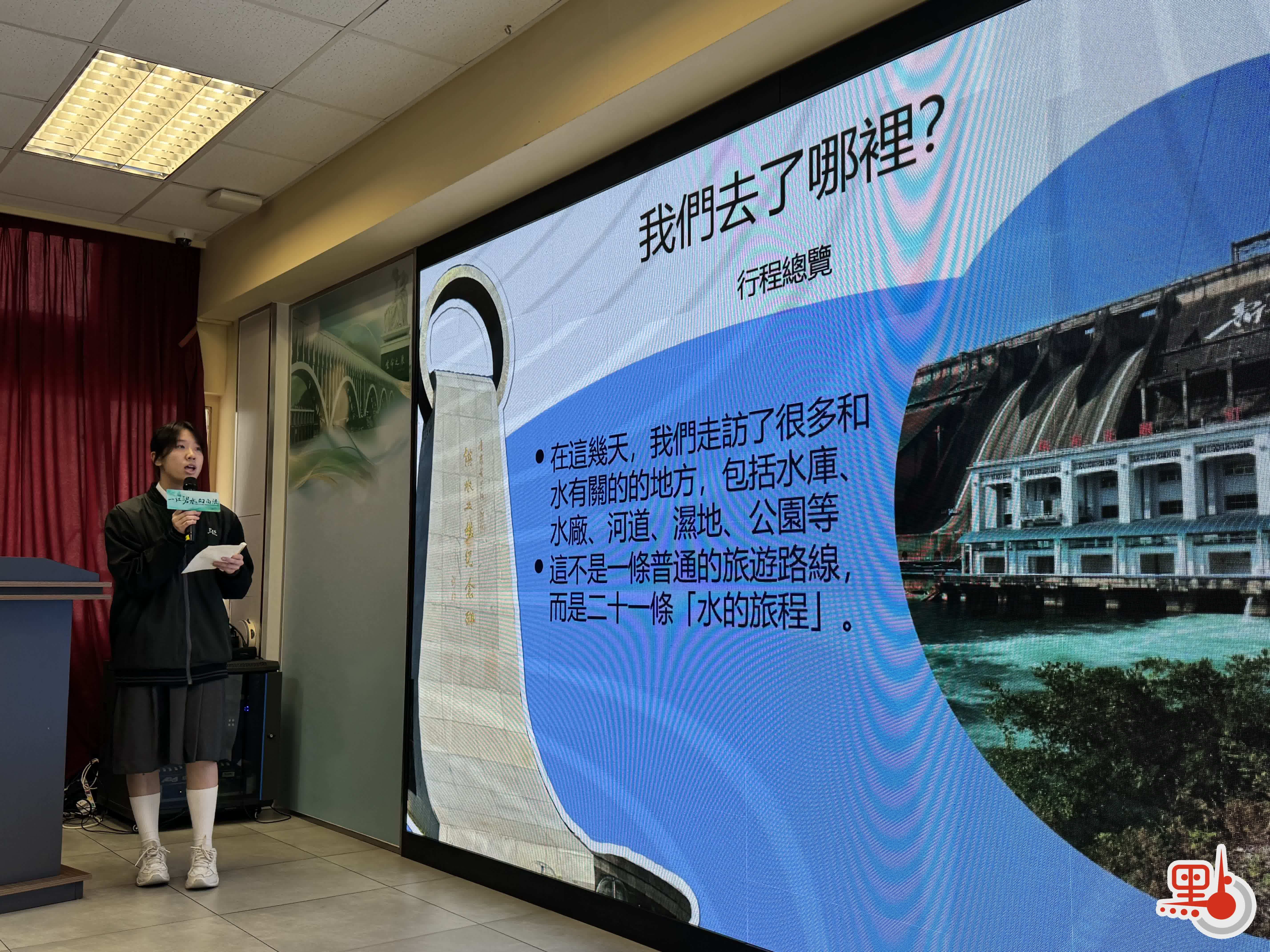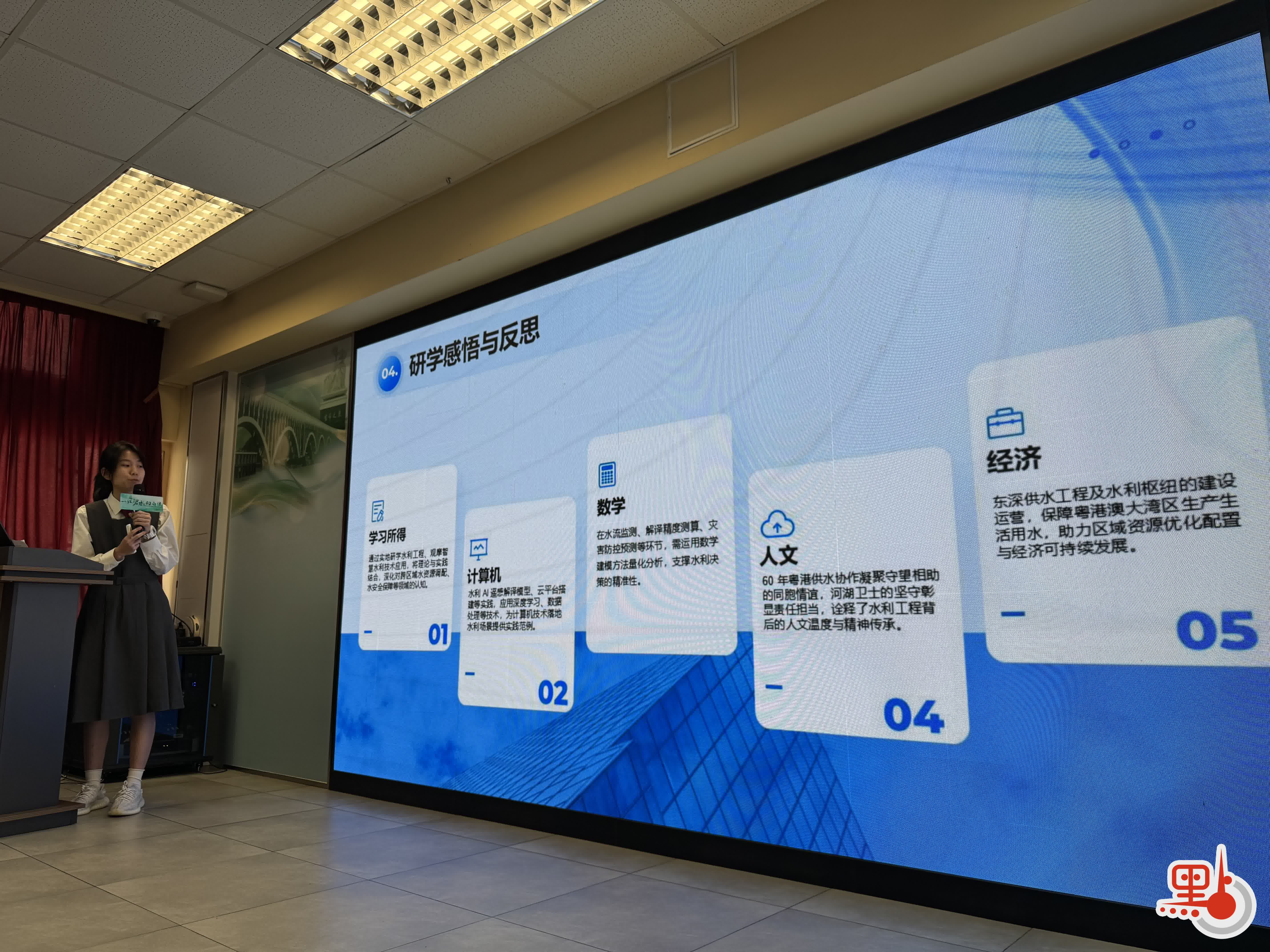 培僑中學學生蔡鏝丹及其組員則聚焦「科技賦能水利,灣區水脈共生」,介紹了現代化水文監測預警體系、水利巡檢四足機器人等科技成果,講述新豐江水庫的生態保護與戰略價值,以及深圳水庫的兩地聯動,強調要飲水思源,以實際行動回饋國家關懷。