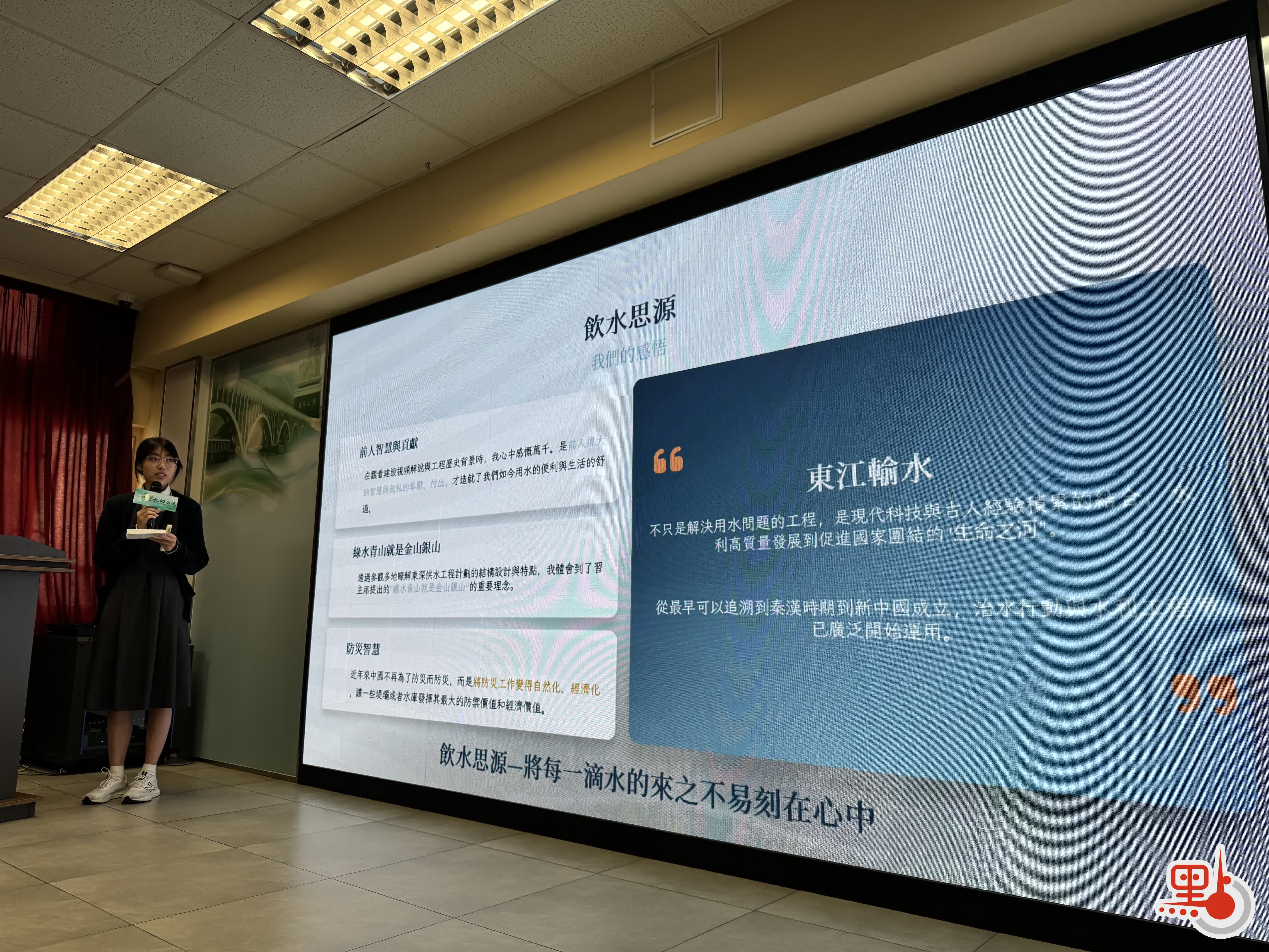 培僑中學學生盧奕及其組員則展示了從南沙水文巡測基地的數據堅守,到新豐江水電站的精神震撼,再到東深供水紀念園的歷史觸動。她表示工程結束了香港缺水困境,並支撐其經濟轉型,她對建設者的無私奉獻與祖國的堅強後盾表示感恩。