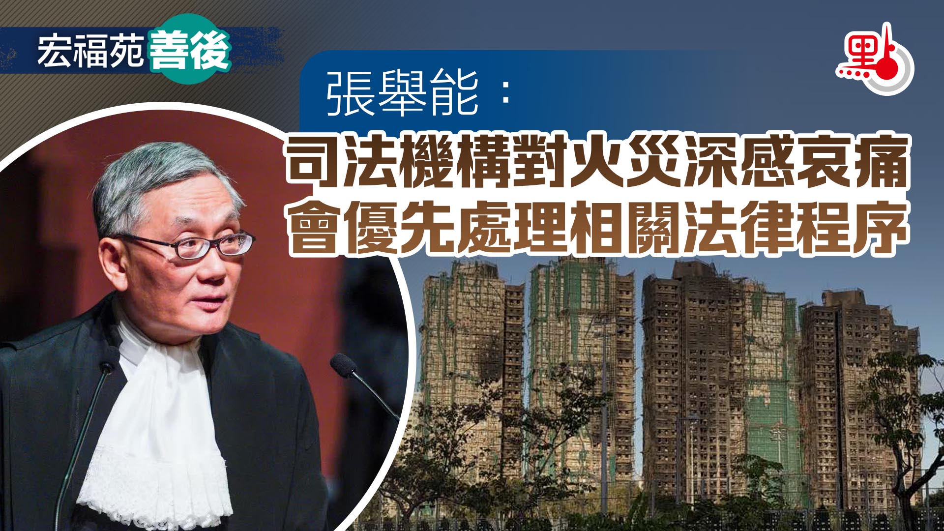 張舉能指出,司法機構已宣布一系列措施,加快和優先處理火災衍生的法律程序。我們已成立一個由高等法院首席法官領導的工作小組,監督各級法院處理與事故有關案件的事宜。此外,我們亦已設立支援隊伍,協助處理遺產承辦事宜並與相關政府部門保持聯繫,我們將會豁免事故中罹難者遺產承辦事宜的相關費用,亦會按個別個案的具體情況考慮寬減其他費用,司法機構會在合適的情況下繼續藉助法律界的支持。