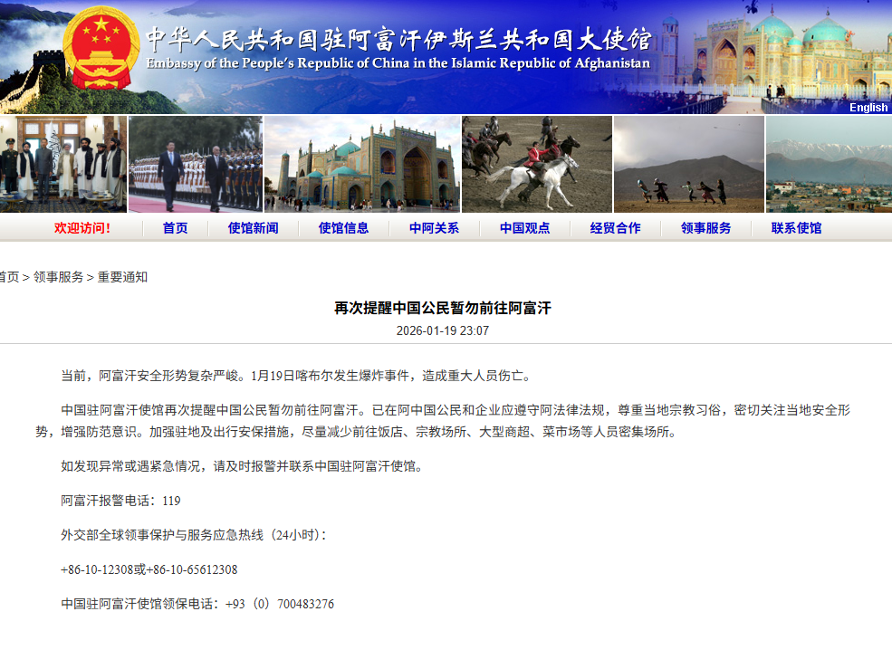 如發現異常或遇緊急情況,請及時報警並聯繫中國駐阿富汗使館。
