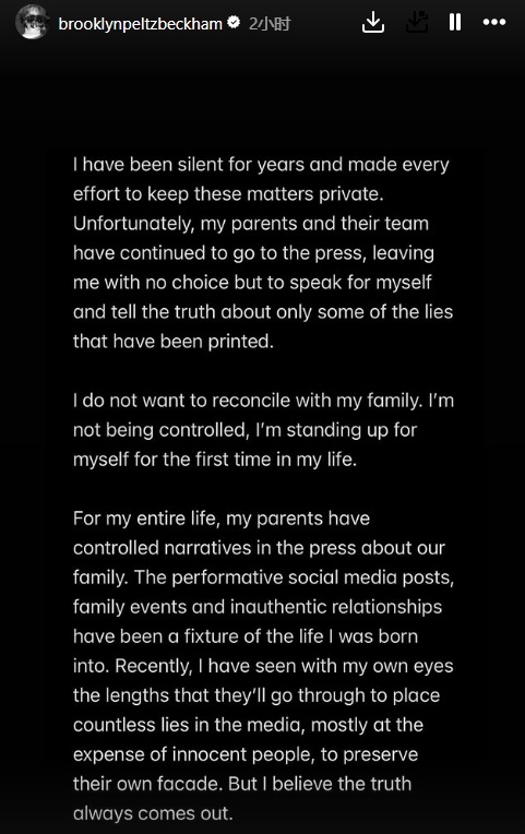 布魯克林在聲明中列舉了很多細節,包括父母優先維護「碧咸品牌」而非真實的親情關係,導致他的一生受到控制。他說:「我親眼看到了他們為了維持自己的假象,能把多少謊言塞進媒體裏,而且往往是以無辜的人為代價。」