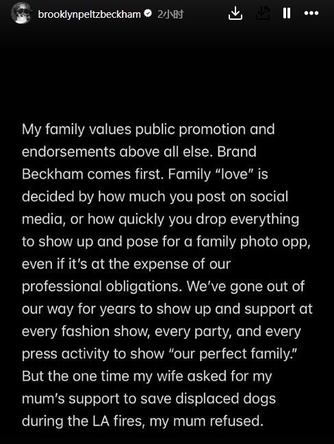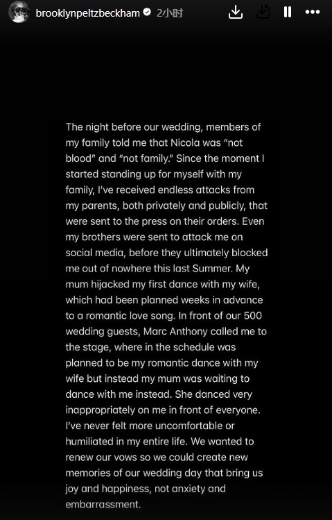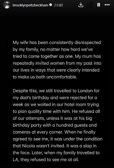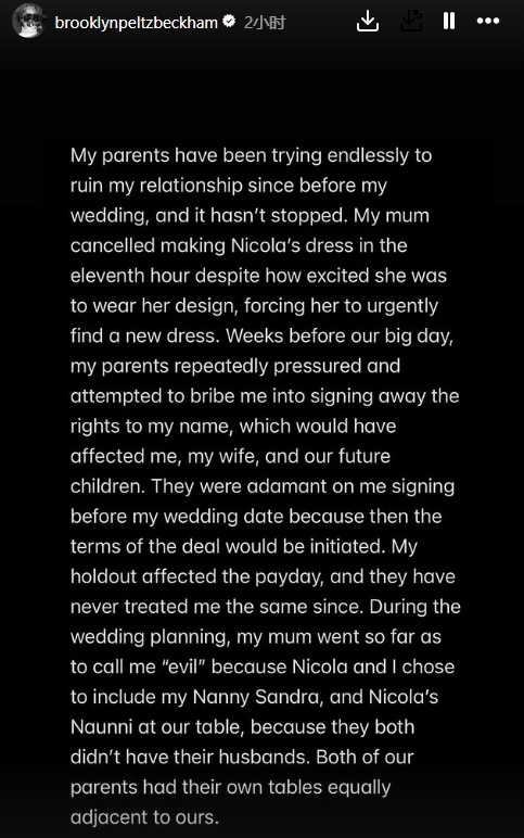 【點新聞報道】英國足球明星碧咸(又名貝克漢姆)家族的內部矛盾達到沸點,1月19日,其長子布魯克林在社交媒體上發表爆炸性聲明,表示從小就在極度焦慮中長大,公開指責父親碧咸和母親維多利亞多年來操控他的生活,並試圖破壞他與妻子妮寇拉·佩茲的婚姻,導致家庭關係徹底破裂。這個帖子目前已不可見,但已在社交媒體上廣為傳播。