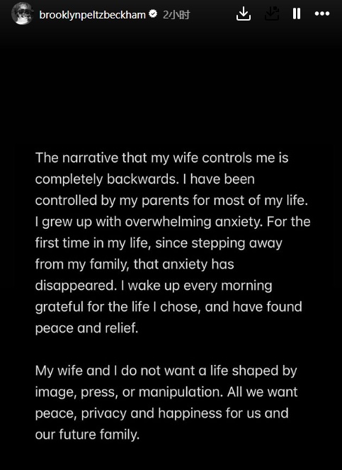 布魯克林說:「我從小就在極度焦慮中長大。離開我的家庭之後,這是我人生中第一次,那種焦慮徹底消失了。我每天早上醒來,都感激自己做出的選擇,也終於找到了平靜與解脫。我和妻子不想要一種被形象、公關或操縱所塑造的人生。我們只希望擁有屬於我們自己,以及未來家庭的平靜、隱私和幸福。」