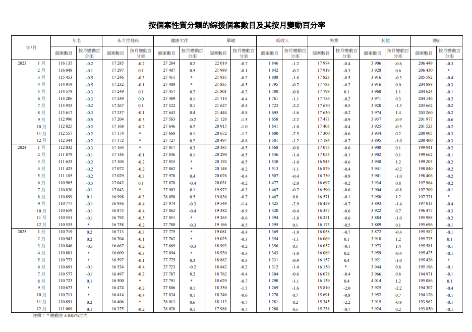 就個案類別分析,單親類別個案及失業類別個案的按月跌幅均為0.7%,分別有17988宗及15238宗。永久性殘疾類別個案下跌0.2%,有16375宗。低收入類別個案則上升0.5%,有1288宗。健康欠佳類別個案及年老類別個案均上升0.1%,分別有28028宗及111009宗。