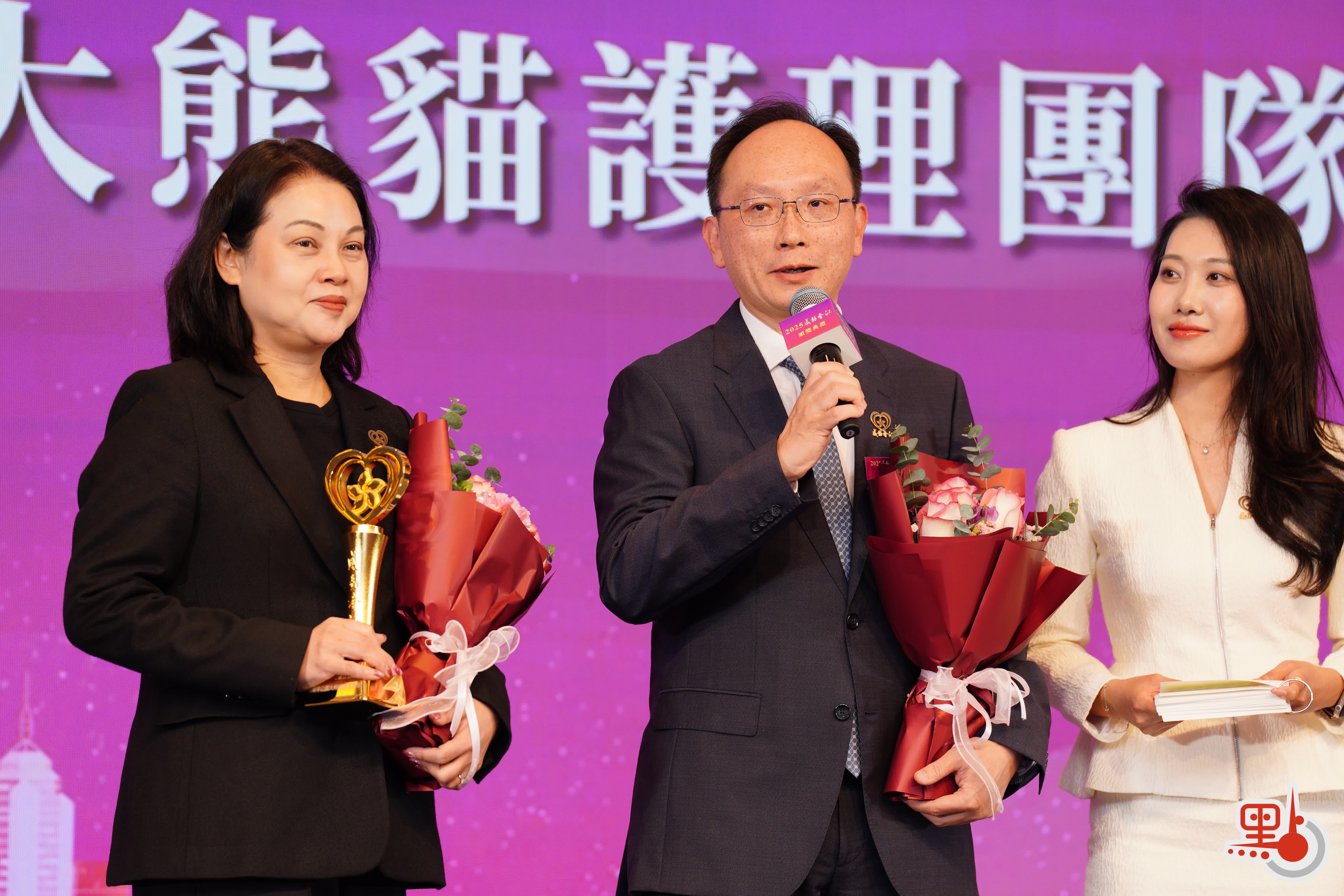海洋公園大熊貓護理團隊代表黃永康指,龍鳳胎出生時「又驚又喜」,當中「驚」的是龍鳳胎出生時只有100克,夭折率高,需要護理團隊維持幾個月「24×7」工作,安排人員人工哺乳,輔助媽媽「盈盈」;「喜」的是見到他們長大,第一次出牙、打交等。他特別感謝國家派出隊伍協助提供意見,強調龍鳳胎成功長大是科學與愛心結晶品。