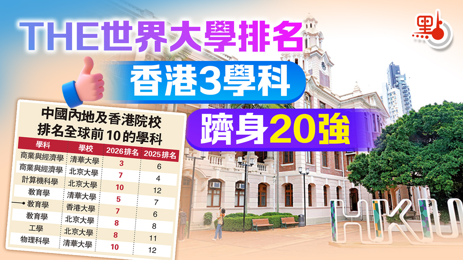 2026泰晤士世界學科排名揭曉 港大9科稱冠香港 嶺大首次上榜
