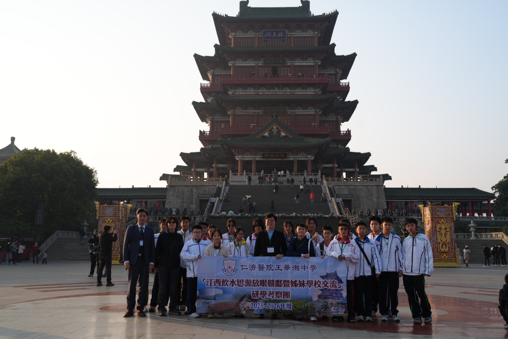 翌日,交流團前往南昌大學附屬學校進行參訪 。仁濟醫院王華湘中學文嘉燕校長帶領兩地師生進行了深入的互動與交流,並舉行了隆重的姊妹學校簽約儀式,進一步鞏固了兩校的合作關係。文嘉燕校長反映,透過與南昌大學附屬學校蒂結姊妹學校,能進一步深化贛港情誼,推動學術交流,讓港贛兩地優勢互補,攜手培育具國家觀念的未來棟樑。隨後,師生登上了享有「江南三大名樓」之首美譽的「滕王閣」 ,在歷史的迴廊中感受古人的文采風流,體驗贛文化的深厚底蘊。