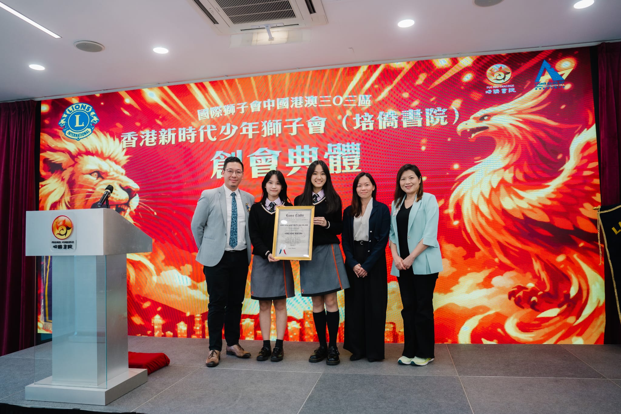 典禮於下午4時30分正式開始。國際獅子會中國港澳303區第一副總監袁秀齡獅姐、上屆總監沈顏獅兄、青少獅子區會長劉悅禧青獅、區青少獅委員會主席鄭嘉麒獅兄,以及香港新時代獅子會會長歐耀邦獅兄等嘉賓親臨出席,與培僑書院中學部校長吳靜雯女士共同主禮,場面莊重而熱烈。