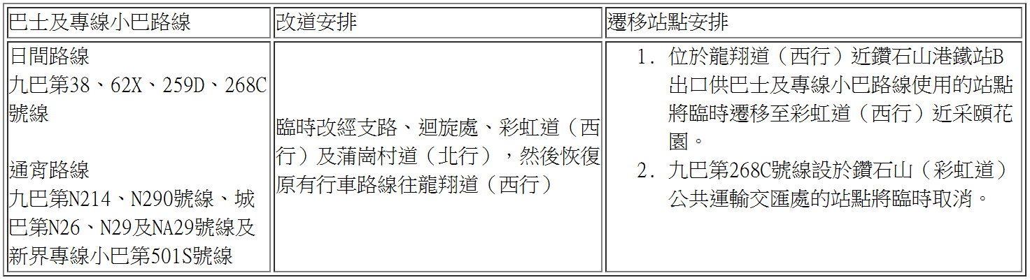為配合上述龍翔道(西行)的全線封路措施,行經該封閉路段的巴士及專線小巴路線將會臨時改道及遷移站點如下: