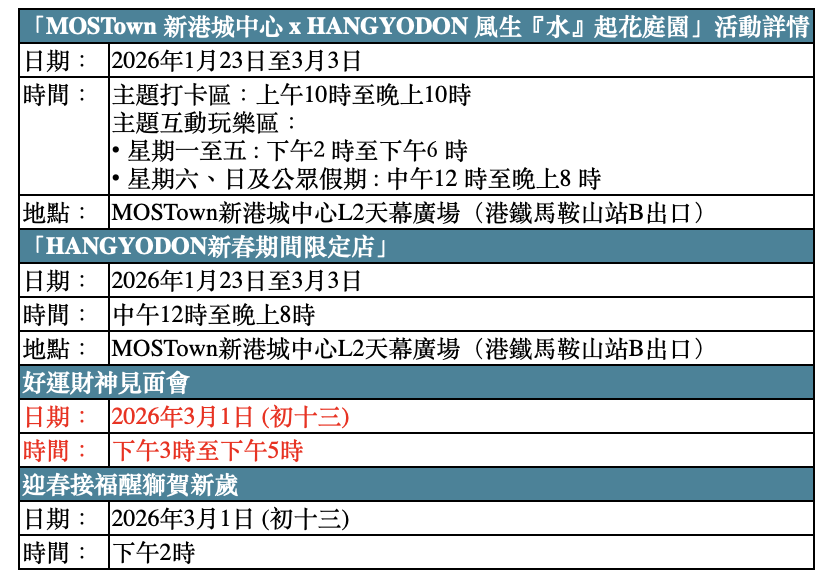 【點新聞報道】新春打卡又有新去處!想過一個「魚」樂無窮、豐衣足食的馬年?今個農曆新年,由1月23日至3月3日期間,MOSTown新港城中心將首度聯乘Sanrio人氣角色HANGYODON(水怪/醜魚),呈獻全港首次亮相的新春限定主題商場裝置「MOSTown新港城中心x HANGYODON風生『水』起花庭園」!