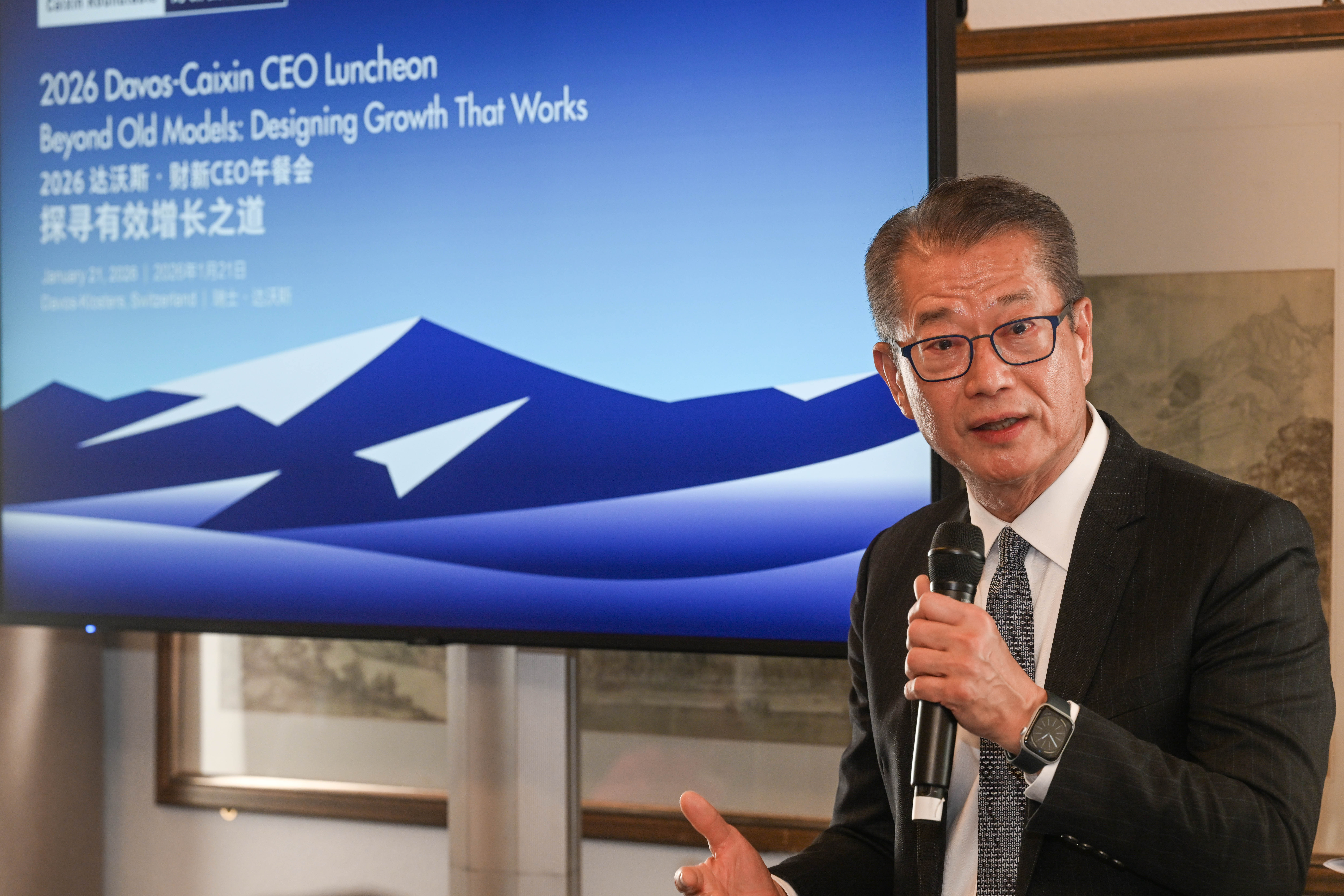 陳茂波中午出席「2026達沃斯·財新CEO午餐會」並發表主題演講。餐會以「探尋有效增長之道」為主題,陳茂波向參與午餐會的嘉賓介紹了香港在過去一兩年所取得的穩健發展,以及未來在金融、貿易和創科三個主要增長引擎的發展願景和布局。