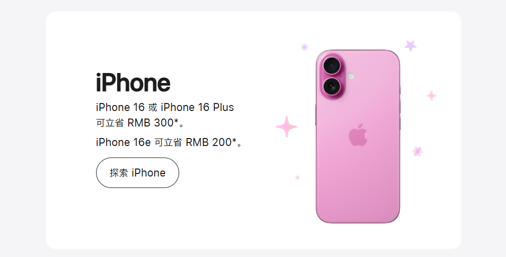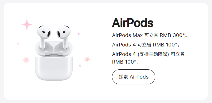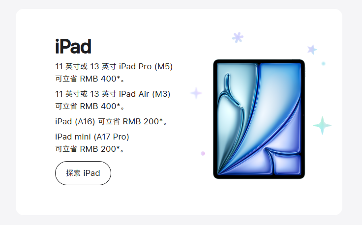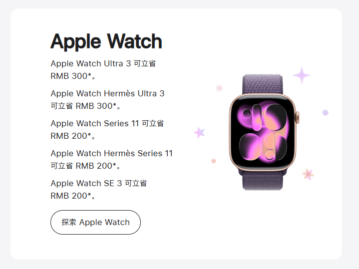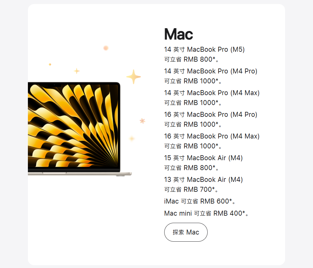 符合折扣條件的產品包括:iPhone16 Plus、iPhone16、iPhone16e、13英寸MacBook Air(M4)、15英寸MacBook Air(M4)、14英寸MacBook Pro(M4Pro或M4 Max)、16英寸MacBook Pro(M4 Pro或M4 Max)、14英寸MacBook Pro (M5)、Mac mini、iMac、11英寸iPad Pro(M5)、13英寸iPad Pro(M5)、11英寸iPad Air(M3)、13英寸iPad Air(M3)、iPad(A16)、iPad mini(A17 Pro)、Apple Watch Ultra3、Apple Watch Series11、Apple Watch SE3、AirPods4、AirPods4(支持主動降噪)、AirPods Max、Apple Pencil Pro。最新發布的iPhone17系列手機產品不在降價範圍內。