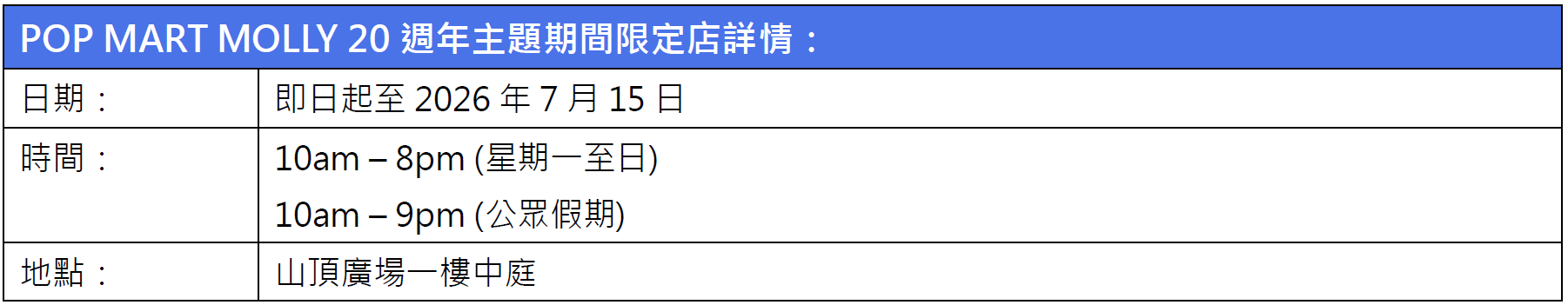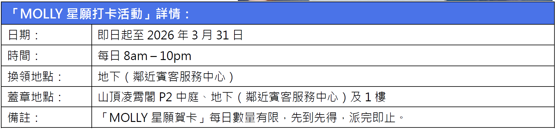 MOLLY粉絲更可前往山頂凌霄閣參與「MOLLY星願打卡活動」,於指定地點收集印章,親手打造專屬你的「MOLLY星願賀卡」,為這趟旅程留下閃耀印記!不要錯過在山頂廣場的POP MART MOLLY 20周年主題期間限定店。MOLLY周年雕塑「風和日麗」樹立於期間限定店門前,門店亦加置了多幅MOLLY 20周年特別設計的插畫,等候MOLLY的夥伴發掘。