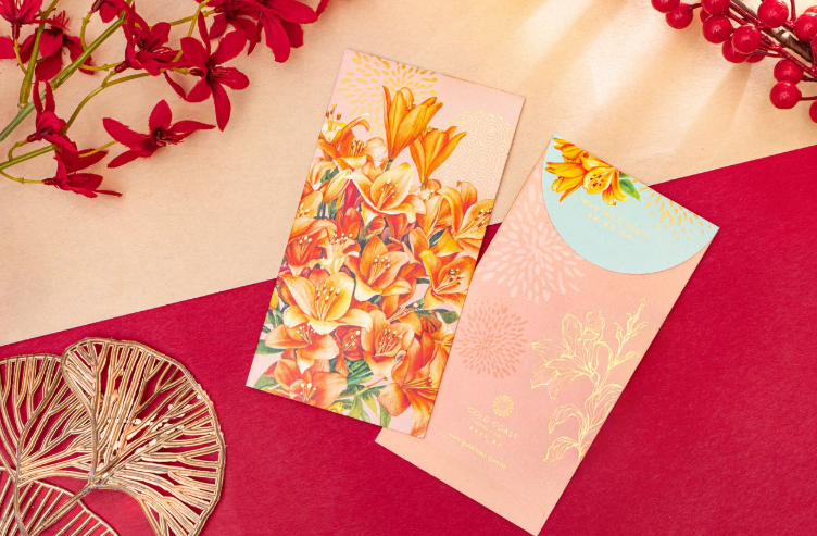 黃金海岸商場今年以農曆新年最受歡迎年花之一「百合」為主題,為大家送上「吉祥百事合意利是封」,利是封以粉紅色作為背景底色再配上柔和珠光,增添高貴喜氣。