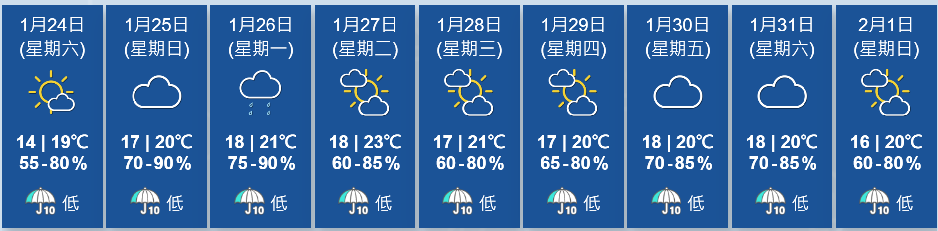 根據天文台9天天氣預測,下周一(26日)天氣回暖,氣溫介乎18至21度,1月27日(周二)最高氣溫更達23度。除2月1日最低氣溫16度外,其他日子的最低氣溫均有17、18度。1月30日(周五)及31日(周六)多雲,有一兩陣微雨。