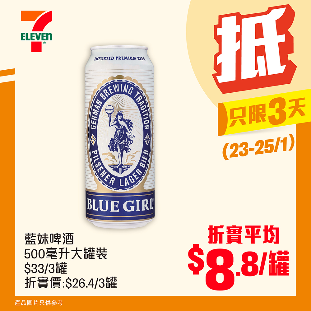 【8折後 $26.4/3罐;折實價平均$8.8/罐】藍妹啤酒500毫升大罐裝
